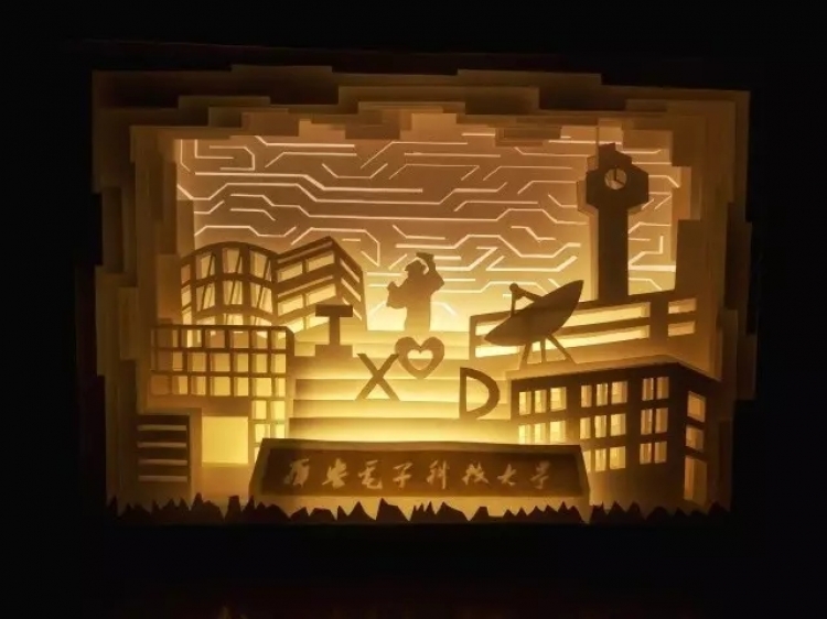 物理与yl8858永利集团2017届毕业生以“光影西电”纸雕灯箱的形式,描绘了他们心中的西电,并将其赠予母校,以此表达自己的西电情。