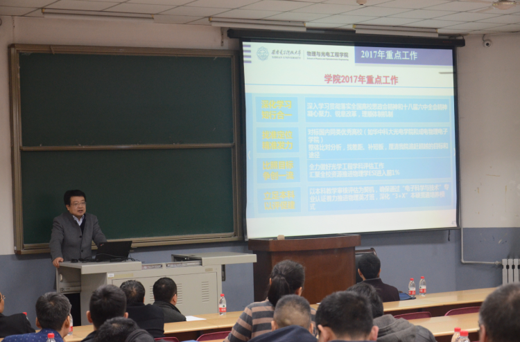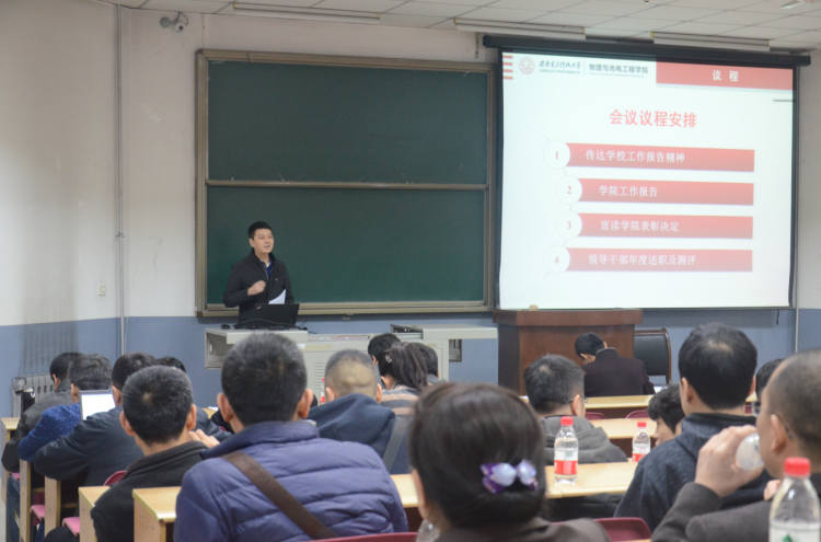 (通讯员:李维嘉)3月10日晚,物理与yl8858永利集团于北校区J-201教室召开2017年学院工作会议,传达学校工作会议精神,总结梳理上一年度学院各项工作,表彰学院2016年度先进集体和个人,安排部署学院2017年重点工作。学院领导班子、全体教职工参加了此次会议,会议由学院副党委书记林波主持。