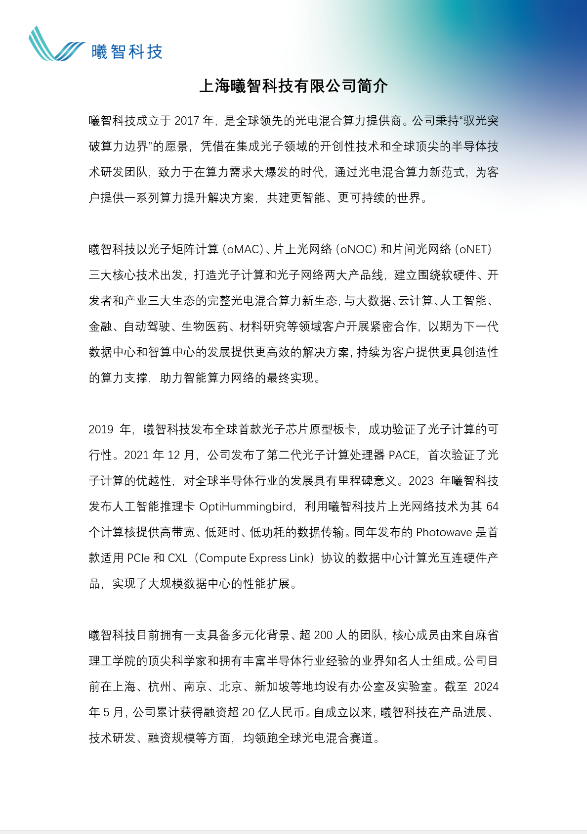 公司一行与公司主要负责人座谈交流,并参观了公司文化及产品展区。光子计算产品线总经理陈辰介绍了公司的创立发展、运营管理及生产研发,公司自2017成立以来,专注于利用光子技术为高性能计算及人工智能计算提供速度更快、能耗更低、时延更优,目前已拥有多项领先核心技术。徐淮良代表学院对“曦智”冠名赞助第十二届全国老员工光电设计竞赛表达了感谢,并表示,学院上下对此次办赛高度重视,已按既定规划完成推进各项工作,后续将继续落实任务、强化细节,在“曦智”及社会各界的大力支持下,办好本届比赛。
