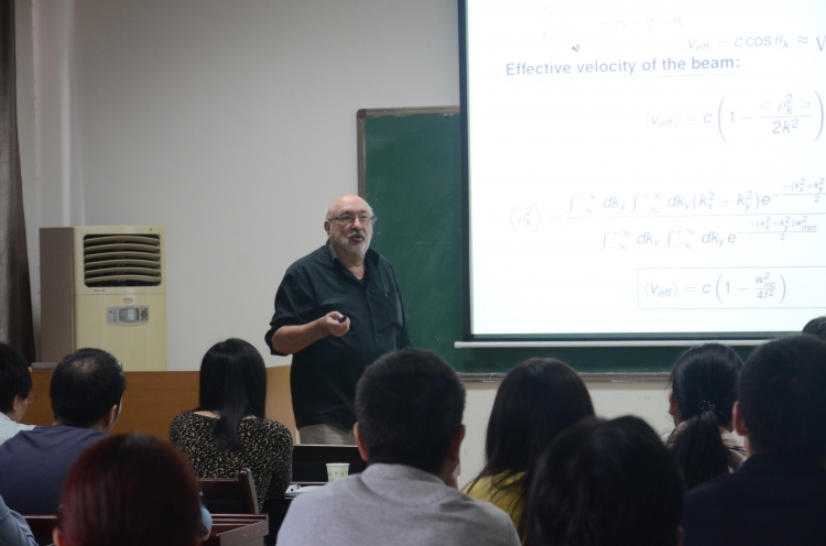 应学院韩一平教授邀请,法国鲁昂大学(University of Rouen)Gousebet教授于4月27日来学院进行学 术交流访问,并在北校区西大楼三区405为广大师生做了题为”On light traveling in free space slower than the speed of light and other curiosities associated to light propagation and light scattering"的学术报告,主要介绍了基于广义米理论提出的关于任意形状光波有效速度的相关研究。