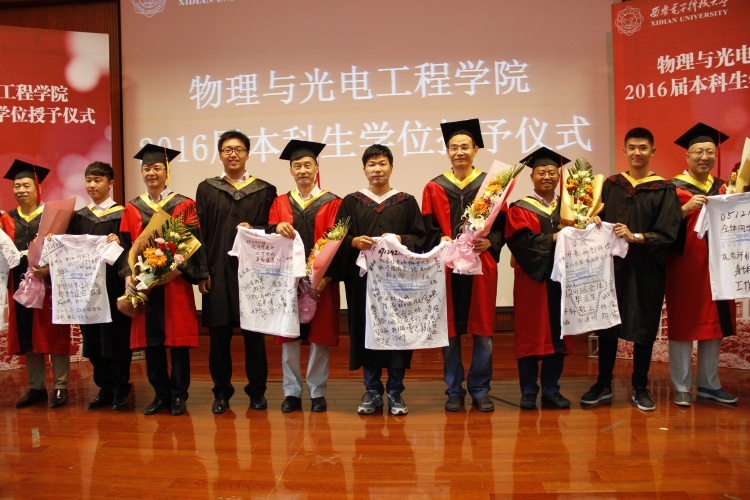 授位仪式后,2016届毕业生代表向出席仪式的各位老师献花,并送上带有全体毕业生签名的T恤,以感谢学校和学院的辛勤培育。几位老师也向毕业生赠予了带有“物理与yl8858永利集团”标志的笔记本,祝愿他们前程似锦,大有作为。