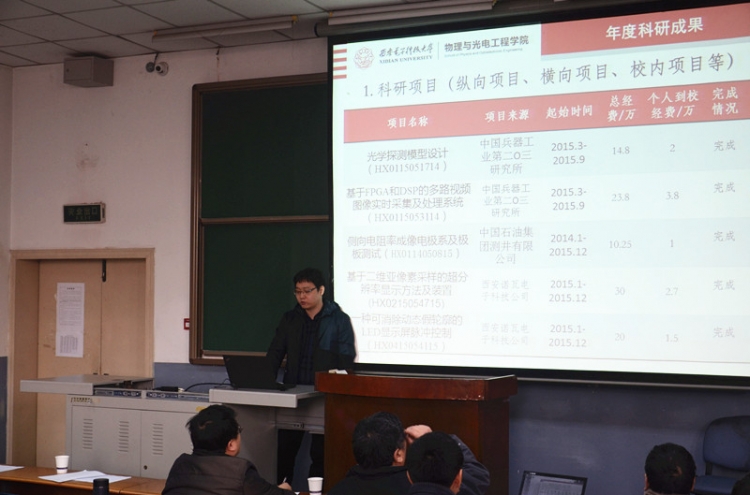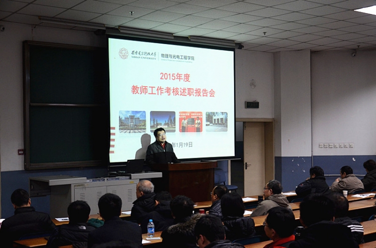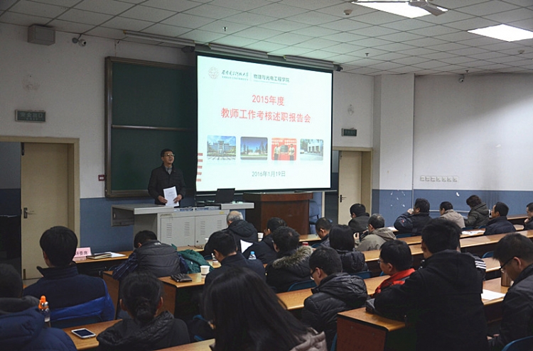 1月19日上午,物理与yl8858永利集团在北校区阶教505举办2015青年教师年度考核总结述职报告会,学院45周岁以下青年教师逐一上台,详细汇报个人一年来的工作情况。报告会由公司党委书记杨光暐主持。