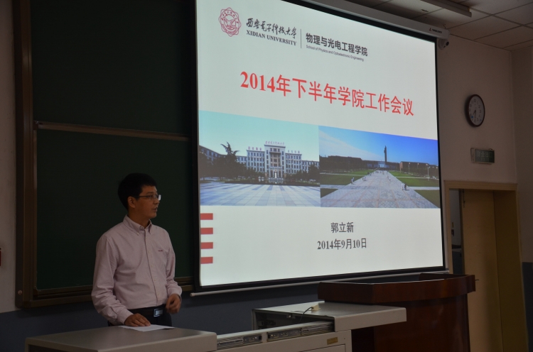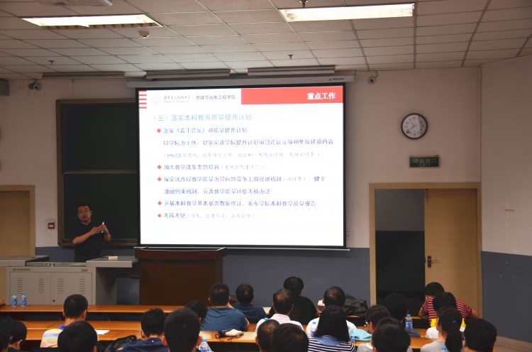 会上,学院执行经理郭立新全面传达了学校工作会议的主要内容,并在简要总结学院上半年工作的基础上,通报了学院下半年重点工作。针对学院发展过程中面临的困难和形势,郭立新结合各项指标完成情况,就本科教学、教师队伍、团队建设、科研平台建设、办公用房调整等方面的工作进行了全面深刻的分析,引起了全体与会教师的共鸣。同时,他还鲜明地提出学院2014年下半年的重点工作思路:一是全面贯彻落实学校五届一次教代会和本科教育质量提升工作会议精神,坚持群众路线,完善治理体系,促进学院融合;二是结合“十三五”规划的启动,谋划好学院学科发展和科研平台建设规划;结合“2011协同中心”,进一步凝练专业方向;三是强化特色立院,全面推行“桃李行动计划”,切实促进教育质量提升;四是积极推进人才工程,切实加大教师(和团队)引进力度;五是推进和中电22所、27所、53所及中航618所等单位的实验室共建工作,积极申报“激光雷达成像”国防重点学科实验室;结合办公用房调整,积极筹建学院“光电探测与成像”实验中心;六是坚持立德树人,推进“老员工基础道德塑造计划”,做好头雁领航、课程地图、学院大讲堂等品牌活动,提高人才培养质量。