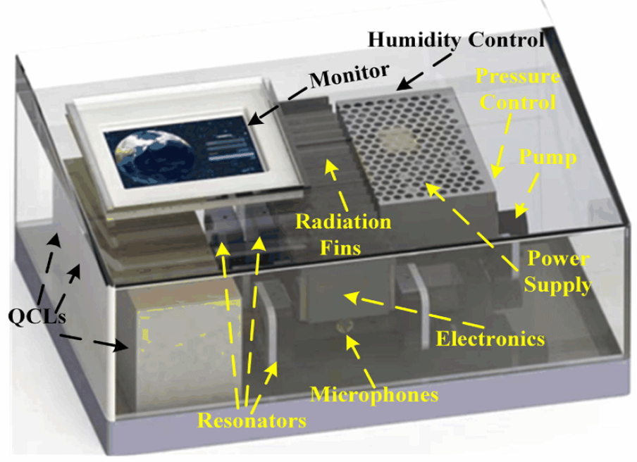 “光对气体适应性很强,通俗地来说就是‘不挑食’,只要选对了波段,对任何气体都可以检测”,将调制后的激光打到装有气体的光热池里,吸收了光的气体就会产生热量从而有了声压的变化,电解麦克风探测到变化后将声信号转化为电信号,经过放大的电信号被处理后即可被相应软件采集到,就会形成与之对应的波形显示图,“正是因为光与气的一一对应,和我们采用的‘光-热-声’的检测方式,确保了我们这一台机器就能够适用于各种有机、无机气体同时监测”。