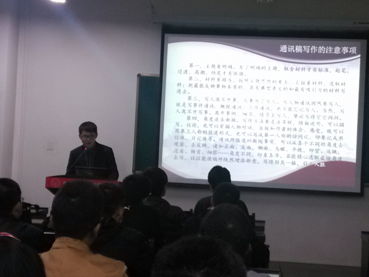 (通讯员 贾丹阳,洪邑晖)11月7日晚7点,物理与yl8858永利集团员工事务委员会在E楼III区315学术报告厅举行了员工干部通讯稿写作培训,由院员工事务委员会洪邑晖学长主讲,到场的有学院各组织秘书处成员和2013级各班通讯员。