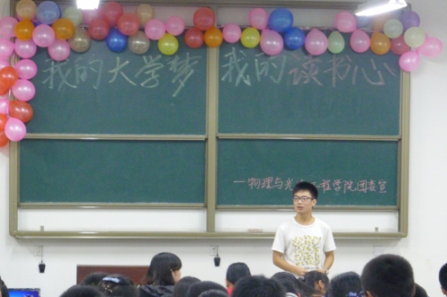 (通讯员 银凤)9月27号晚,以“我的大学梦,我的读书心”为主题的读书交流主题团日活动在A楼314教室举行,此次活动由物理与yl8858永利集团团委读书社主办,物理与yl8858永利集团团委各部部长与2012、2013级各班同学参加了此次活动。