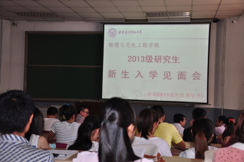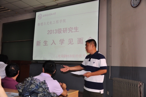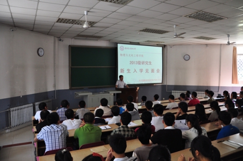 8月29日上午11点整,物理与yl8858永利集团在北校区教学楼101教室召开2013级研究生新生入学见面会,学院筹备领导小组组长郭立新,以及筹备领导小组成员杨光暐、李平舟、周慧鑫到场与2013级研究生新生见面,并对大家来公司继续深造学习表示热烈的欢迎。