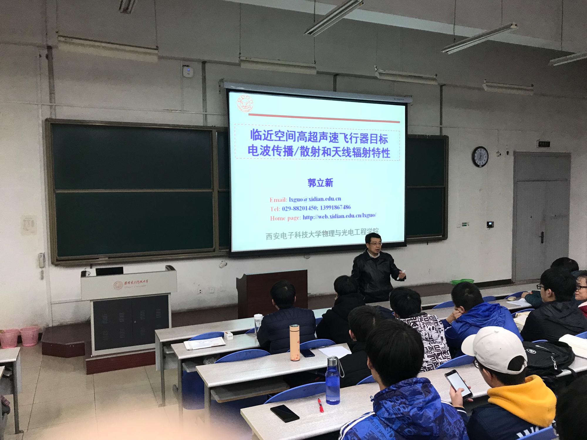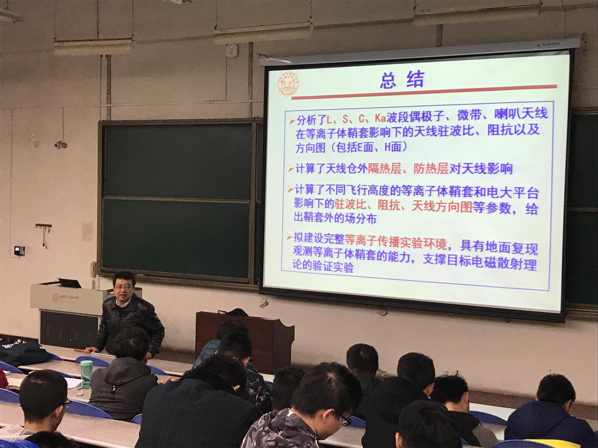 (通讯员:宫超越)2017年11月30日晚七点,物理与yl8858永利集团于B433教室开展了题为“临近空间高超声速飞行器目标电波传播/散射和天线原理辐射特性”的学院大讲堂活动,由物理与yl8858永利集团经理、教育部长江学者特聘教授郭立新主讲。郭经理从该项目的重要内容“等离子体鞘套”入手,结合研究进展,为大家生动地展示了其重要意义,让同学们感受到了所学专业对国防事业的重要贡献。