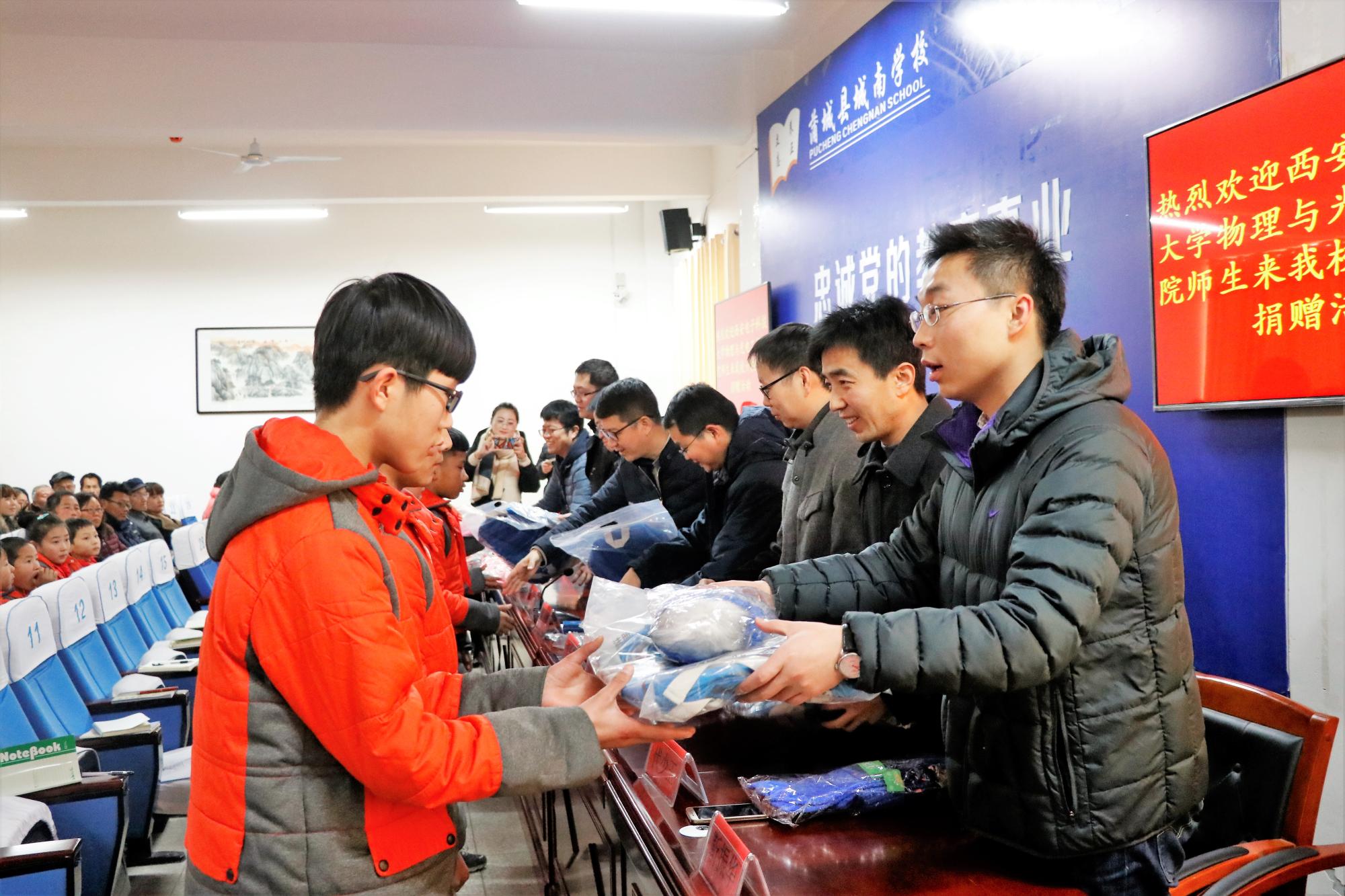 在捐赠仪式上,学院向蒲城县城南学校建档立卡的家庭经济困难员工赠送了书包、帽子、手套等学习用品和生活用品,并向城南学校赠送了各类体育器材。