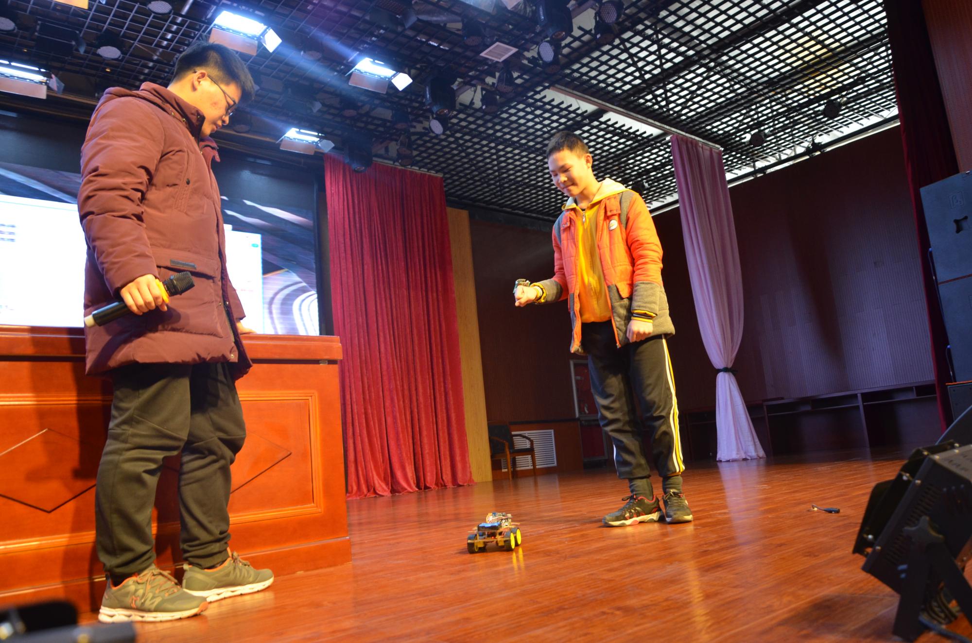 与此同时,学院的5位老员工代表还为城南学校的初中阶段的800余名同学们带来了一场题为“精彩的老员工活”的励志分享会。他们通过图片、视频,讲述了大学阶段丰富多彩的学习、生活,并结合自己初高中的经历以及公司产品环境分析,让同学们了解到学习的重要性,鼓励同学不断追求更高的平台,提高自己的视野,永远对学习保持求知若渴态度。在展示西电员工自己的科创作品时,城南学校的同学们争先恐后上台体验互动,表现出了极大的兴趣和热情,表示要努力学习,将来争做科技人才。