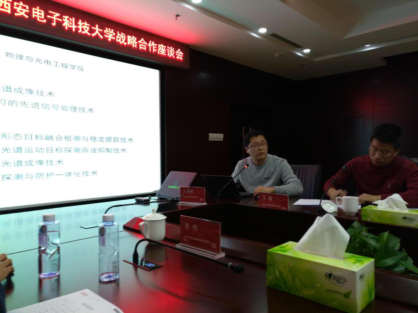 会上,庞国荣对学院的到访表示欢迎,并简单介绍了中电53所的发展历程和基本情况,在谈话中他指出,自2014年起,中电53所与西电的战略合作伙伴关系已经走过了三个年头,期间双方合作融洽、互帮互助、共同发展,在相关合作领域取得了一定的成绩,双方应继续营造和谐积极的合作氛围,争取更上一层楼。随后,王锴结合光电信息控制和安全技术重点实验室的相关工作,从光电探测、光电预警、光电告警、光电成像等多个方面,具体讲解了目前实验室的研发焦点。