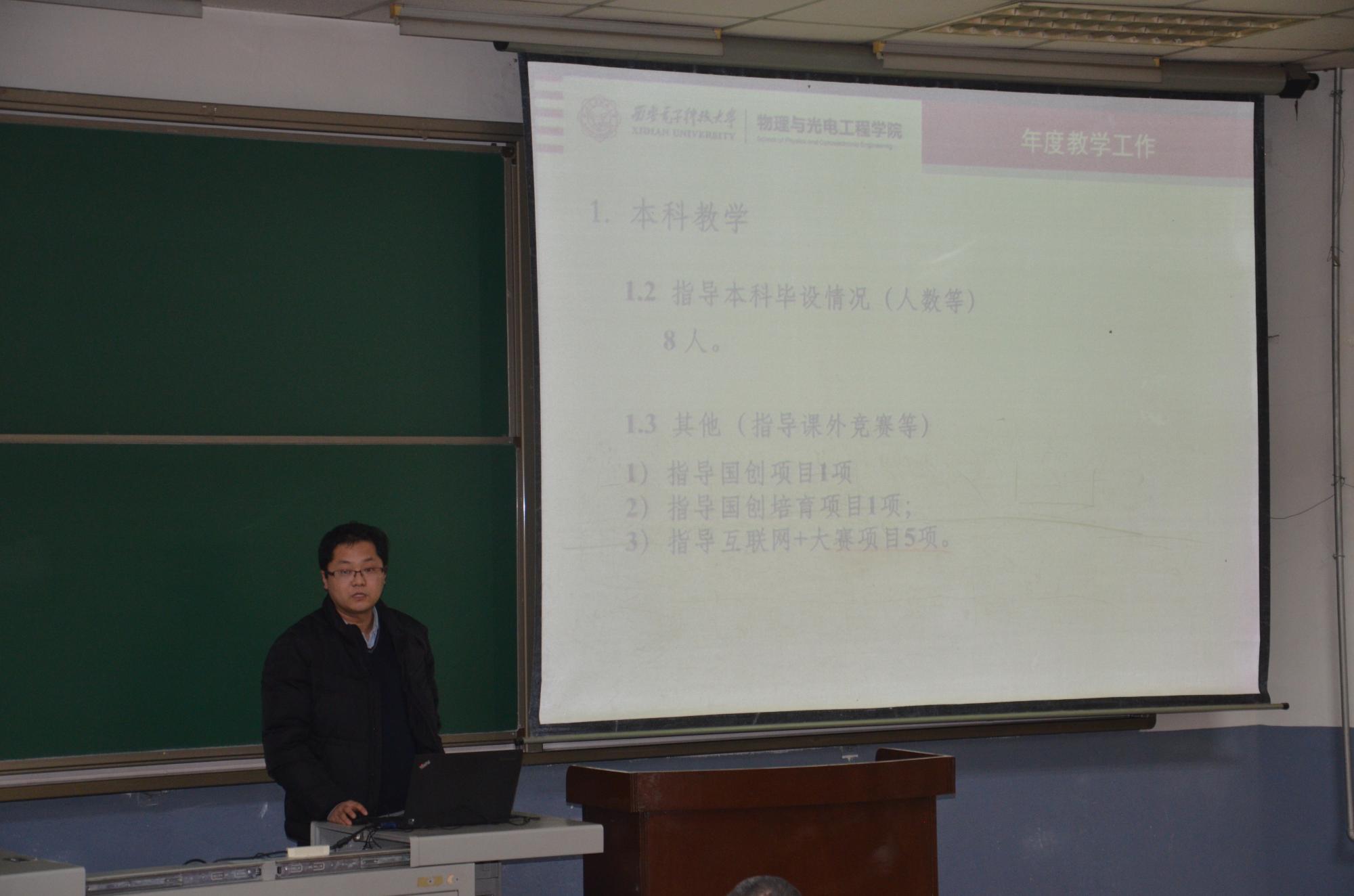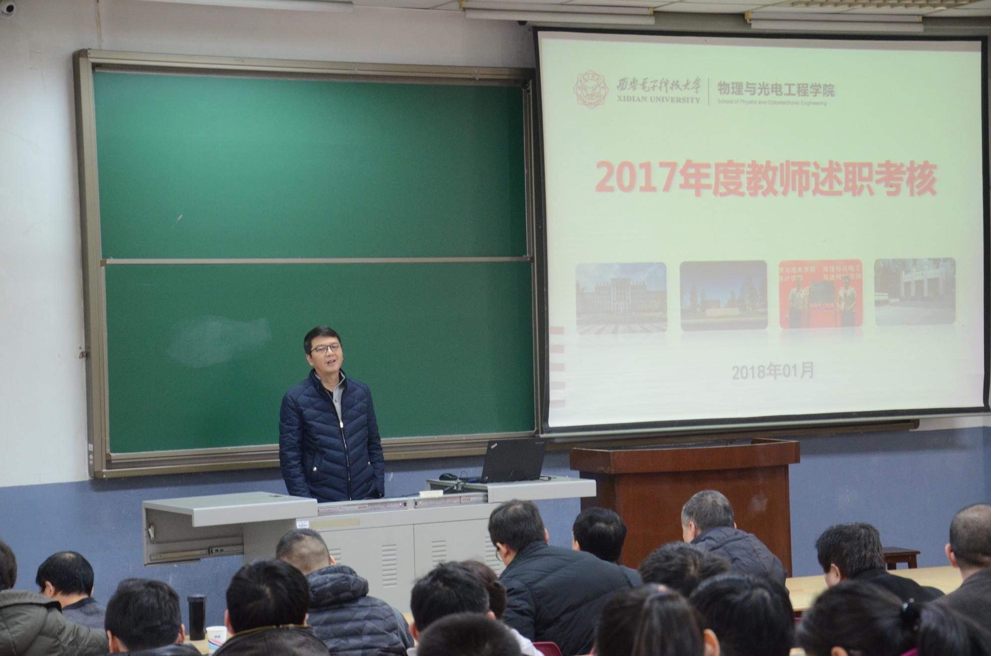 1月21日下午14:00,物理与yl8858永利集团于北校区J-101教室举办2017青年教师年度考核述职报告会,学院40周岁以下青年教师逐一上台,就本年度的工作成果进行总结汇报。学院领导班子、学术委员会全体成员作为评委参加本次活动,学院全体教师与会,参与整个活动全过程。报告会由公司党委书记杨光暐主持。