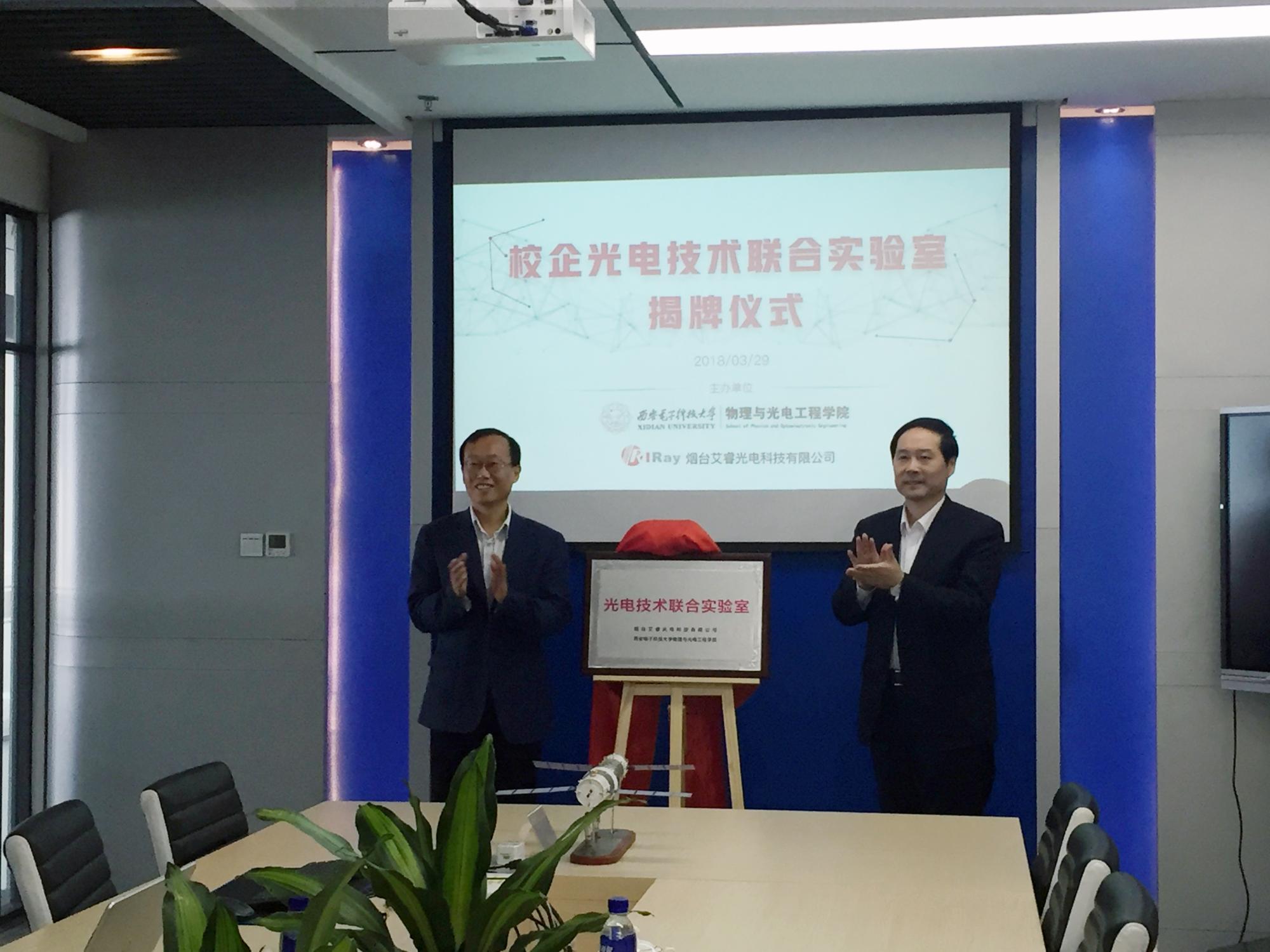 yl8858永利集团物理与yl8858永利集团—烟台艾睿光电科技有限公司校企光电技术联合实验室正式成立。3月29日上午,联合实验室揭牌仪式于烟台艾睿光电科技有限公司举行,烟台经济技术开发区管理委员会副主任孙赋欣、物理与yl8858永利集团副经理邵晓鹏、艾睿光电科技有限公司总经理王宏臣、营销总监张刚等出席了揭牌仪式。仪式由王宏臣主持。