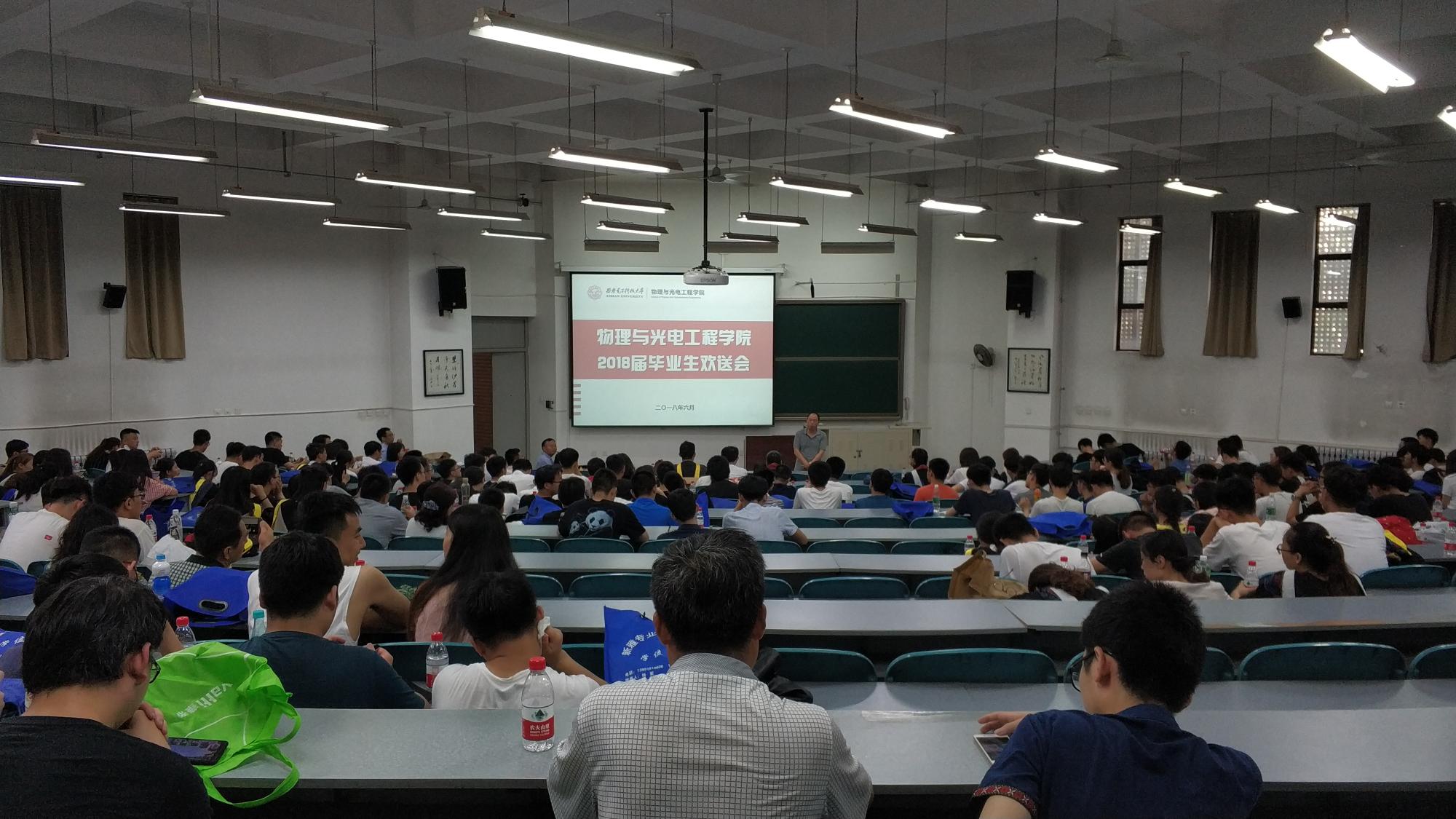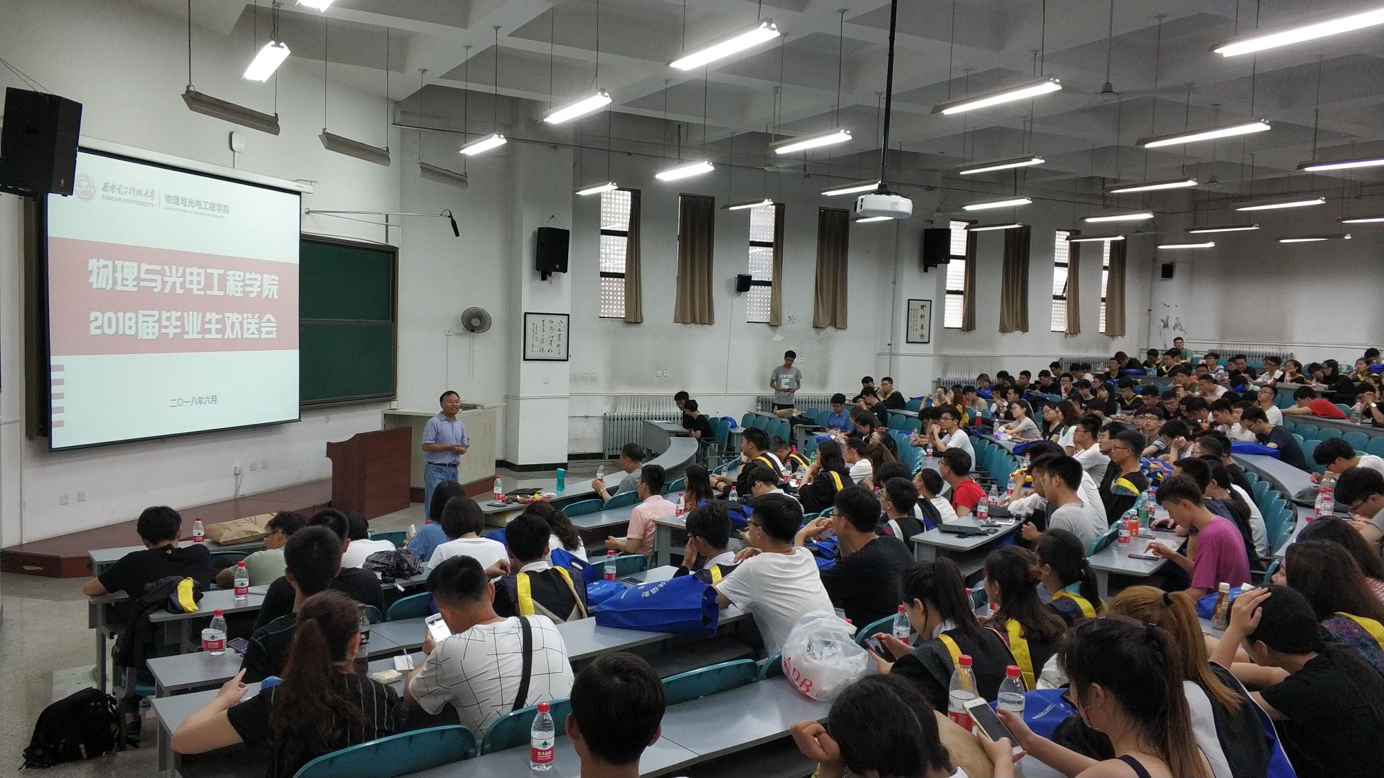 6月25号上午,授位仪式开始前,学院2018届本科毕业生欢送会在D楼206教室举行。学院副经理李平舟、“毕业生最喜爱教师”代表朱江峰以及学院2018届全体毕业生共同参加了欢送会。欢送会由毕业班辅导员陈海涛主持。