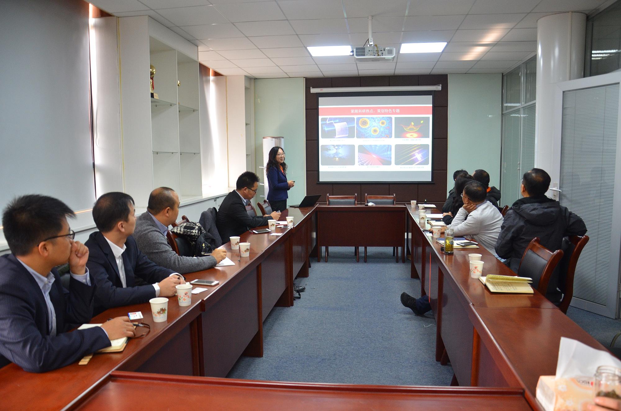 座谈会上,邵晓鹏代表学院对中国激光杂志社一行的到来表示热烈欢迎,从学院的发展沿革、团队队伍、公司产品、科学研究和发展思路等方面对学院的基本情况进行了介绍,并着重介绍了物光院在论文发表、期刊服务等方面与中国激光杂志社的紧密交集。杨蕾详细介绍了中国激光杂志社的情况及发展愿景。她提到,中国激光杂志社全面报道中国光学领域的最新成果,争做“光”的追梦人, 以“共享资源,共享经验,抱团取暖,做大做强”为宗旨;致力于光学专业学科期刊集群的发展,提供专业的科研服务。