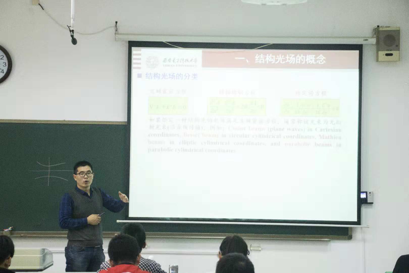 首先,崔老师从结构光场技术的概念切入引出研究背景,对Newton微粒学说、Huygens波动学说、Maxwell电磁波理论、Einstein光子理论以及Maiman激光发明等内容进行说明,由此讲述了随着人们对激光认识的不断深入与激光技术应用迅速扩展而逐步实现的具有多种振幅、相位、偏振态及相关结构等具有特殊空间分布的新型光场——结构光场。随后,崔老师针对结构光场的分类与产生进行了详细的对比讲解,从具有螺旋相位的涡旋光场、偏振态依赖空间分布的矢量光场、具有横向自加速效应的Airy光场到具有无衍射传输特性的Bessel光场、具有非傍轴自弯曲效应的Mathieu光场、可沿任意轨迹传输的类贝塞尔光场以及具有非高斯空间相干结构的部分相干光场等,并对这些空间结构光场展现的光子轨道角动量、超衍射极限紧聚焦、无衍射自弯曲传播、自分裂自整形等一系列物理效应进行说明。紧接着,崔老师又从结构光场的调控与应用展开,将各种结构光场产生的新颖效应进一步拓展到激光技术的工程领域,结合经典光通信、灵巧光操控、光学超分辨成像等现实应用,激发同学们对于深入探索新颖空间结构光场的兴趣,并分析了其成为当前光学相关学科领域研究热点的原因。最后,崔老师还向大家介绍了其教研室的在研课题、科研团队以及实验室建设等情况,鼓励同学们在打好理论基础的同时可以进入实验室提前接触专业知识,进一步明确未来发展方向。