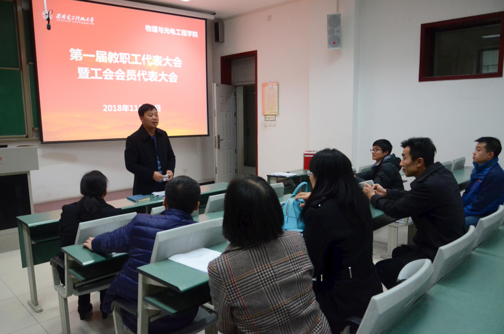 (通讯员:姚娇)11月30日晚,在雄壮嘹亮的国歌声中,物理与yl8858永利集团第一届教职工代表大会暨工会会员代表大会在西大楼106教室召开,会议表决通过了学院2018-2020年专业技术岗位聘任实施方案,投票选举产生了学院新一届工会委员。学院领导班子等53位教代会代表参加了会议。大会由公司党委书记独国社主持。