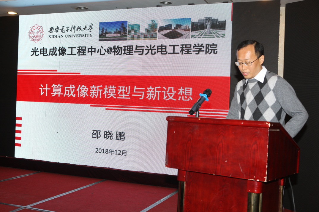与会专家相继做了精彩的学术报告,参会人员热情高涨,会场座无虚席。邵晓鹏教授以《计算成像新模型与新设想》为题,着眼于全局设计思想,提出了基于复数模型的光电成像新理论,引入了成像相位的概念,该概念将引领光电成像技术走向“摩尔”时代;同时提出了新型光学系统和探测器设计设想,该设想将有望克服传统光学系统弊端,进一步简化结构、缩小体积、降低成本、提高性能。