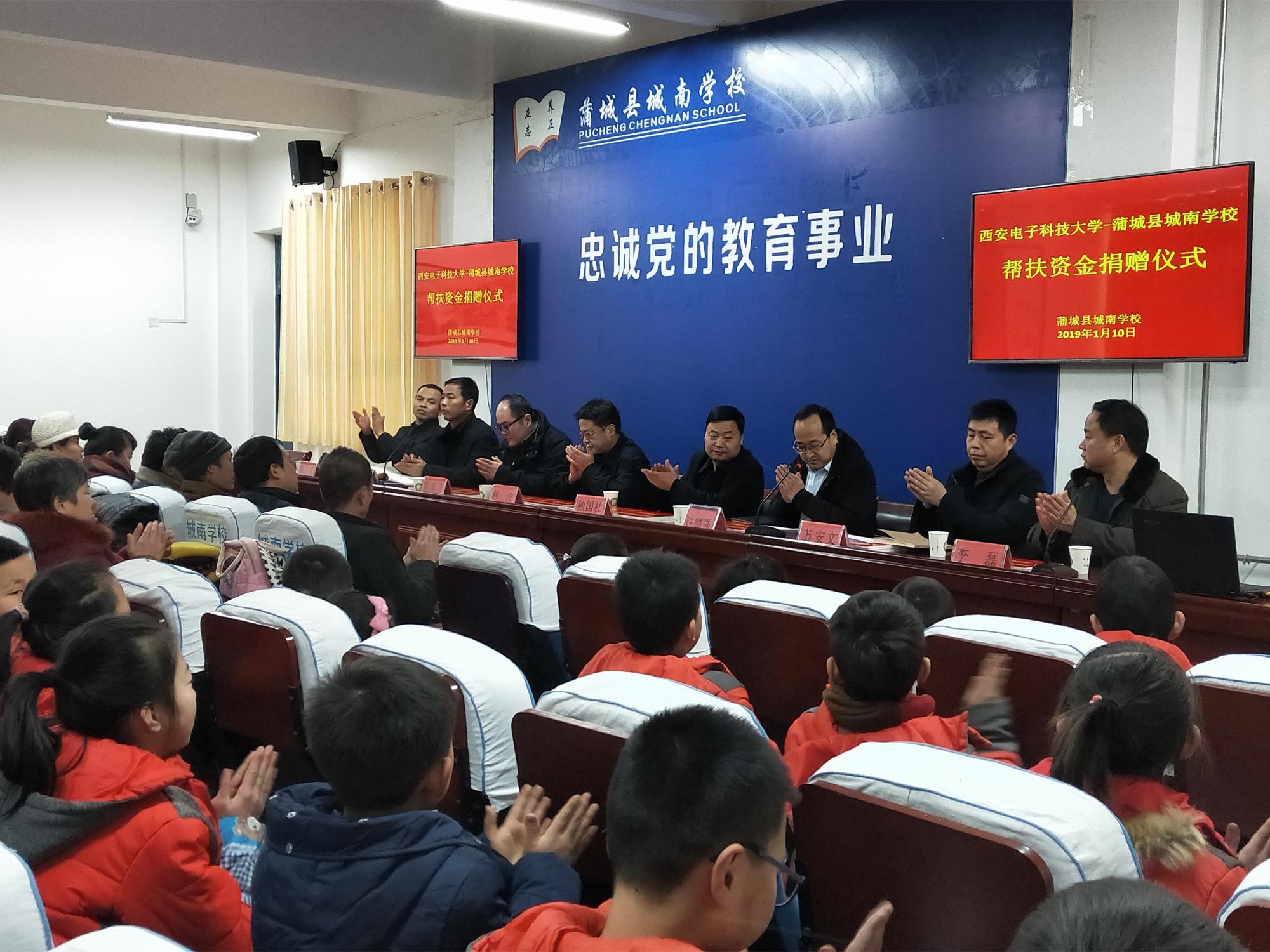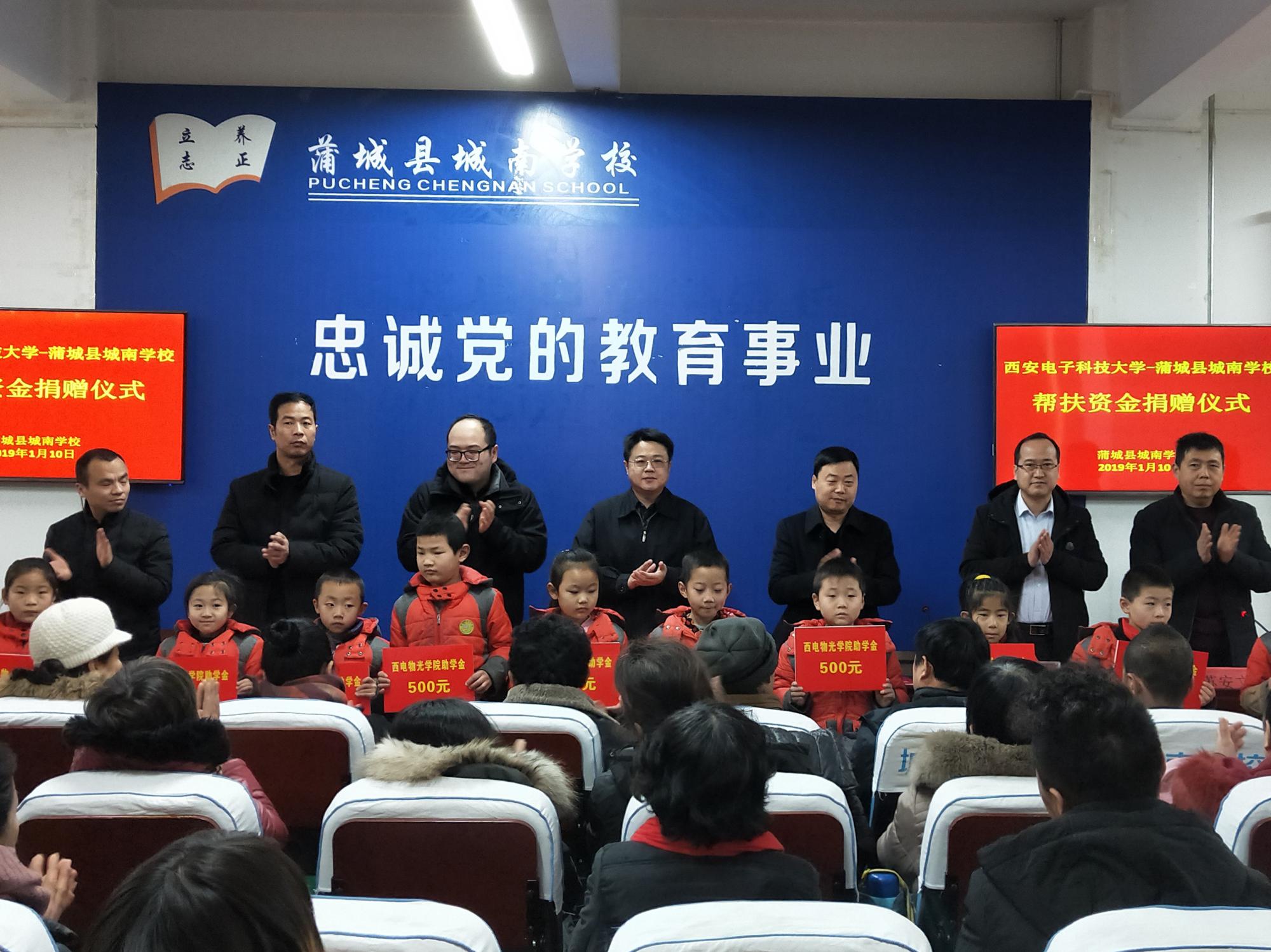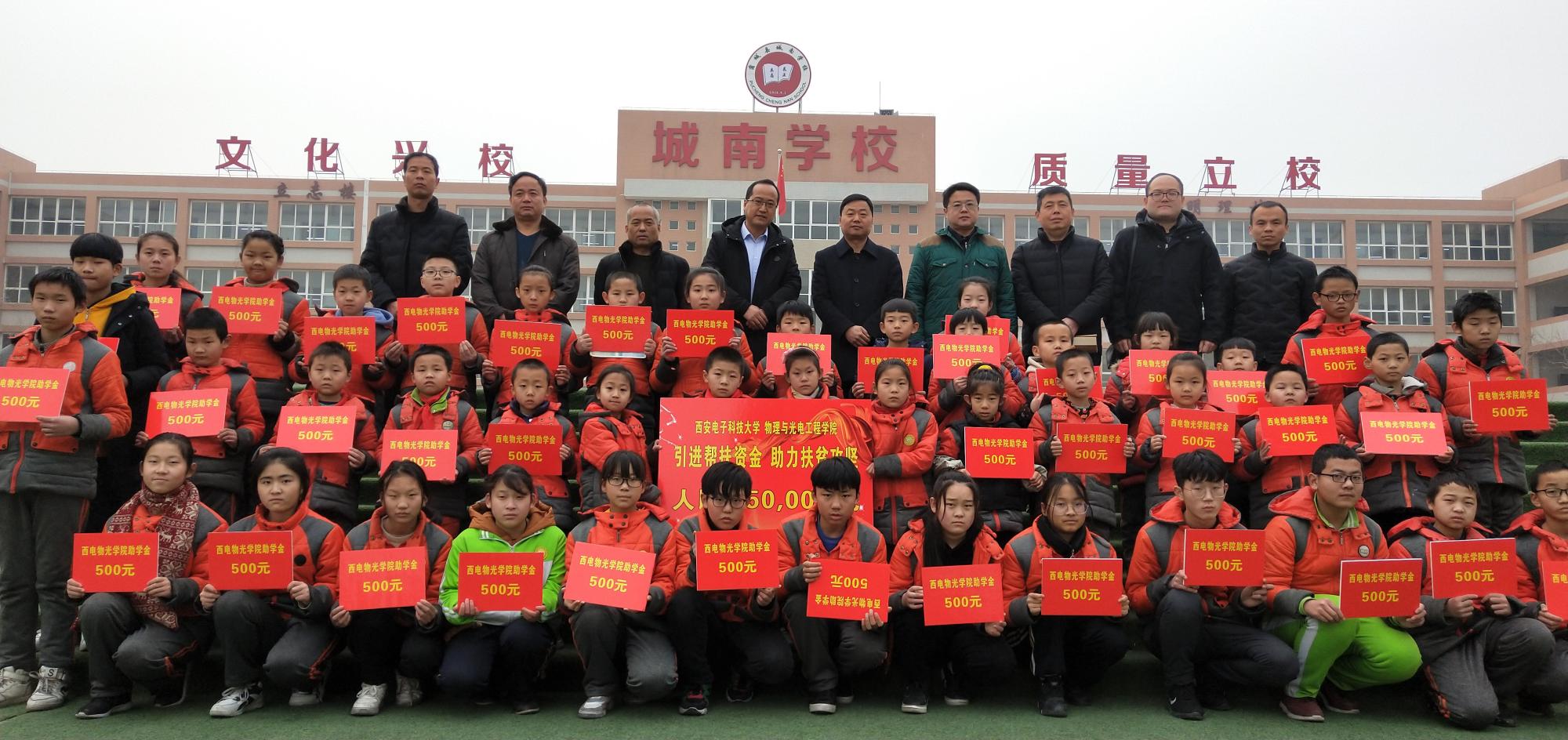 捐赠仪式上,独国社在讲话中谈到,学院充分发挥高校在国家脱贫攻坚工作中的特殊优势作用,将“扶贫”与“扶智”、“扶志”相结合,多次向蒲城县城南学校捐赠课外书籍、文体用具、科创工具,开展对接洽谈、志愿授课、科技讲堂等各类扶贫对接活动多次,建立了蒲城县城南学校“yl8858永利集团老员工志愿服务基地”、“yl8858永利集团物理与yl8858永利集团老员工实践基地”,援建“西电物光院-蒲城城南学校员工科技活动室”,并邀请城南学校师生来公司参观交流。本次学院发挥员工企业与合作单位资源优势,与西安中科洺光测控技术有限公司、洛阳长峰电子科技有限公司签署协议,引进5万元帮扶资金,用于设立“2018年yl8858永利集团—蒲城县城南学校贫困生‘物光助学金’”和帮助改善城南学校基础教育设施。城南学校要用好帮扶资金,为员工提供更加优质的教育服务,使受助员工能够不受经济困难束缚,早日成长为祖国的栋梁之才。希望同学们铭记社会各界的深情关爱,正视并战胜困难,不负家庭和社会的厚望,把关爱化为奋发学习的动力,坚定信心,自强不息,刻苦学习,提高素质,练好本领,努力成为对国家、对社会有所作为、有所贡献的人才,以优异的成绩和将来的出色表现,报效祖国,回报社会。
