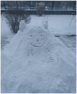 为了保障道路通畅和行人安全,在2月14日当天,家住内蒙古赤峰市的17级本科生孙少波在刺骨冰雪中不顾寒冷和辛苦,满腔热情,手拿铁锹积极参加除雪行动。经过3个多小时的奋战,孙少波和社区志愿者为社区清理出一条整洁安全的通道。同时,他们利用移除的积雪堆出雪人,写下“武汉加油!”的祝福。孙少波谈到:“人多力量大,大家在一起才能这么顺利的完成任务,除雪行动帮助大家解除障碍,引导大家在疫情期间也要热爱生活,还锻炼了疫情期间我们并肩战斗、同舟共济的精神,坚定了我们战胜病毒的决心。虽然我不能去一线,但是希望这个雪人能传达我对一线夜以继日努力救援的同志们的敬意,武汉加油,中国加油!”