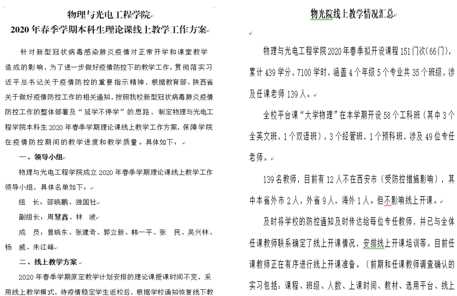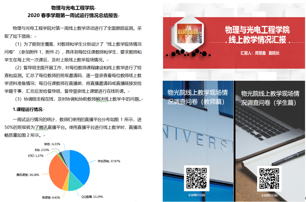 按照“延学不停课、不停学”的要求,学院积极组织开展线上教学,专门制定实施方案、应急方案、基本要求和工作建议,成立了领导小组、督导组、协调工作组等,保障线上公司产品工作正常进行。学院领导带领教学办公室同志、辅导员等积极组织师生开展线上授课培训、网络平台试用和调研反馈,及时掌握实际情况和存在问题并协调解决,协助任课教师开展在线课程建设。在第一周上课期间,学院通过网上问卷方式每日坚持在师生中开展调研,及时了解情况、解决问题,汇总分析形成报告,向有关部门提出具体意见建议,并总结了课程案例。学院还积极组织教职工开展线上教学课题研究工作,目前已向学校提交了两项课题申报书。