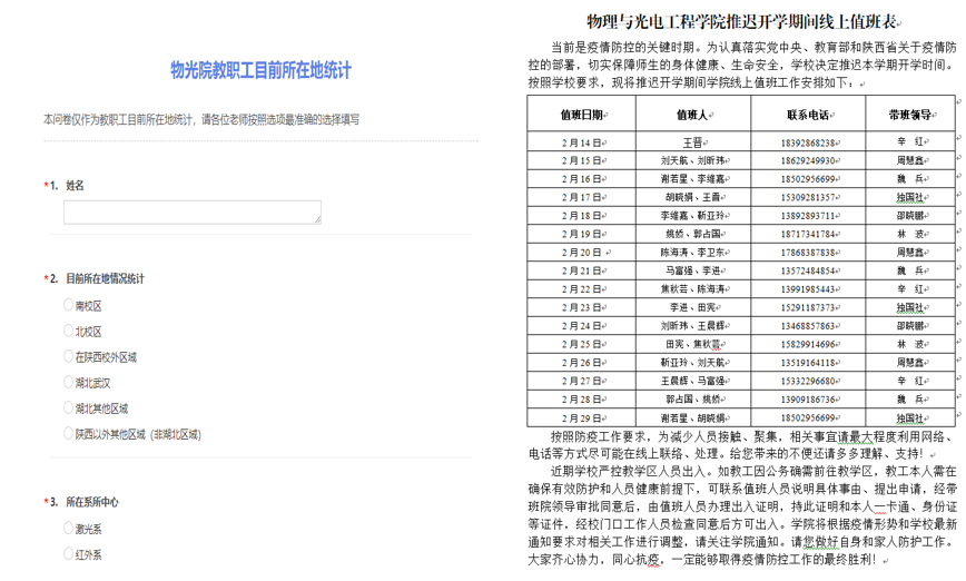 大年三十,接到学校防疫工作要求后,公司党委第一时间安排部署,在教职工支持配合下,不到一小时完成防疫相关情况初步筛查。第一时间制作了网上调查问卷,使教职工通过微信方式完成居住地等防控信息填报。学院及时成立了以党委书记独国社和执行经理邵晓鹏为组长、其他院领导为成员、院办主任为联络员的疫情防控应急工作小组,组织工作力量、建立防控机制、制定应急措施、处置突发问题。通过召开在线会议,及时安排延迟开学期间值班工作,部署防控具体事项和在线教学准备等工作。