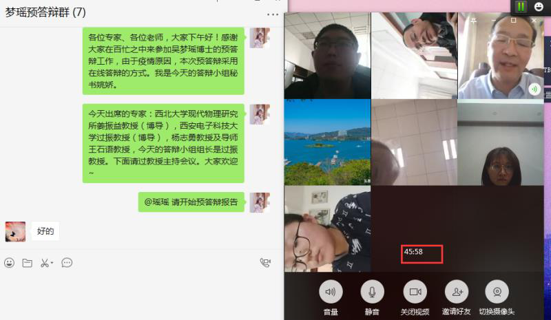 博士生吴梦瑶预计今年6月份申请获得博士学位,她从1月底放假回家后就一直忙碌于博士学位论文撰写及学位申请等工作。学校为保证2020届毕业生能够如期完成学业,在严格把控学位论文质量的基础上,提供了成绩单线上打印、学位论文线上预答辩等一系列方便快捷的办事流程,让毕业生在保证居家学习、身体健康的前提下,依然能够按时按期的完成毕业生学位申请。目前,吴梦瑶已经完成了博士学位论文的全部撰写和线上预答辩,能够如期完成博士学位论文送审工作。线上预答辩采用了微信群视频的形式,预答辩小组成员共五人,满足学校对博士学位论文预答辩的要求,答辩过程总时长1小时8分钟,保留了完整的视频截图以及答辩录像。