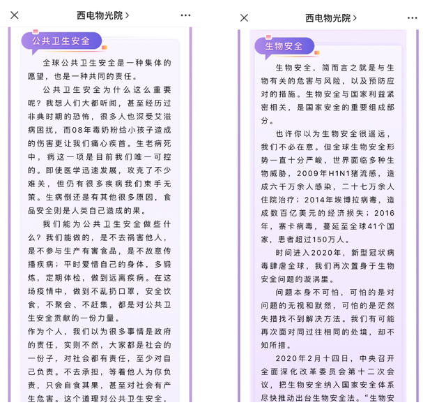 (通讯员 龚京彧)2020年4月15日是第5个全民国家安全教育日,今年的活动主题是“坚持总体国家安全观,统筹传统安全和非传统安全,为决胜全面建成小康社会提供坚强保障”。在全民国家安全教育日来临之际,学院在第一时间通过学院公众号推送了今年的普法宣传内容,结合防控疫情着重介绍了公共卫生安全和生物安全的主要内容,并组织学院16级和17级的一千余名员工通过中国老员工在线、易班网、国家开放大学网站及有关在线教育平台分别在PC、平板或者手机上认真观看公共安全领域专家、中国工程院院士范维澄教授主讲《总体国家安全观视角下的疫情防控》高校公开课。