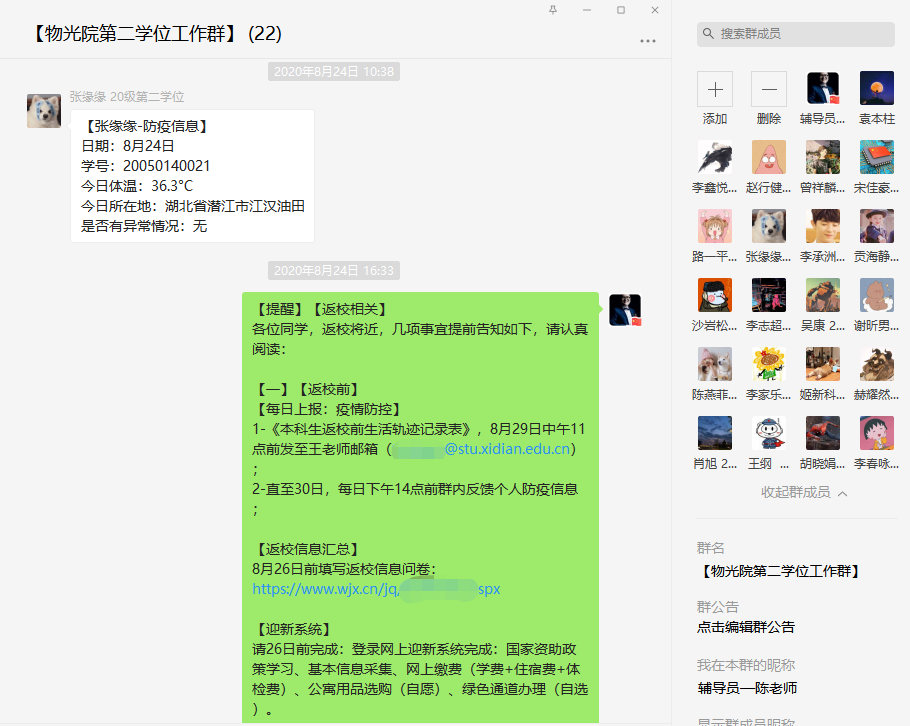在录取结果公布后,学院辅导员第一时间与员工取得联系,介绍校院基本情况,掌握员工当前学习生活环境和身体状况;建立线上沟通微信群,及时将学校第二学士学位相关讯息通知到位,每日记录员工疫情防控信息,动态更新返校前活动轨迹,逐一前往新生所在宿舍,查看床铺准备情况;来校前,辅导员通过腾讯会议进行线上点名,将报到注意事项、疫情防控要求、新生入学体检等相关事宜进行说明,并就员工关于来校交通、公寓入住、饮食采购等问题进行解答。