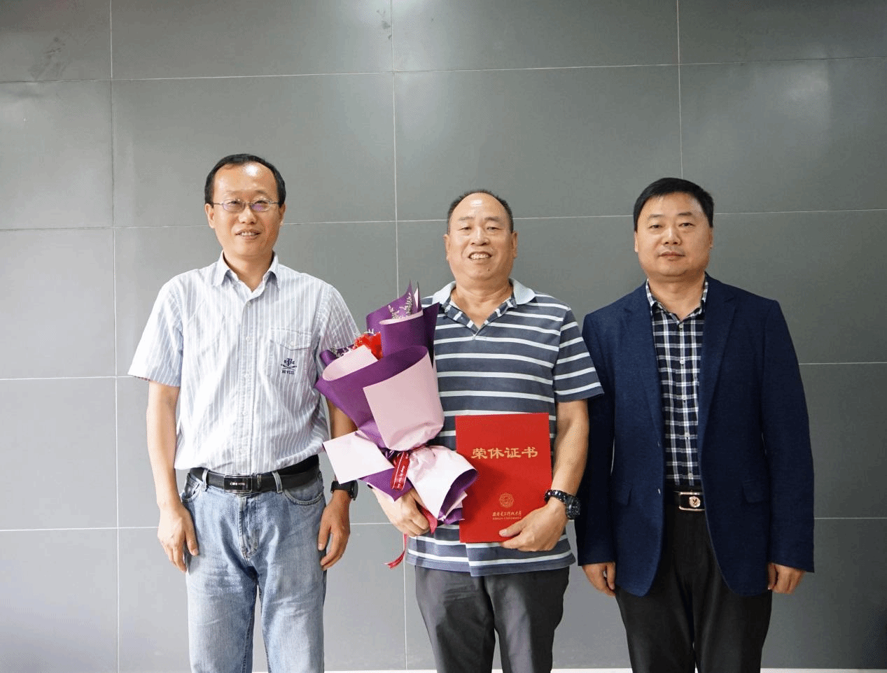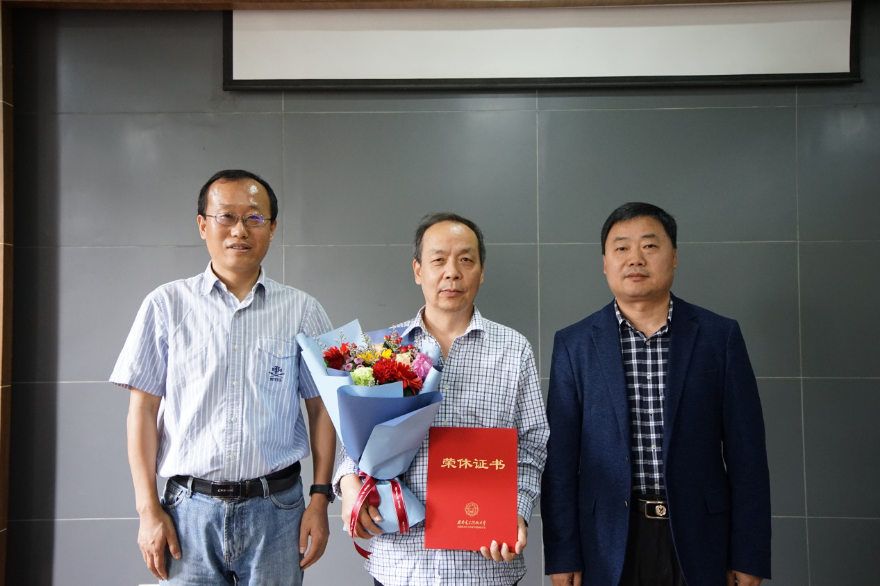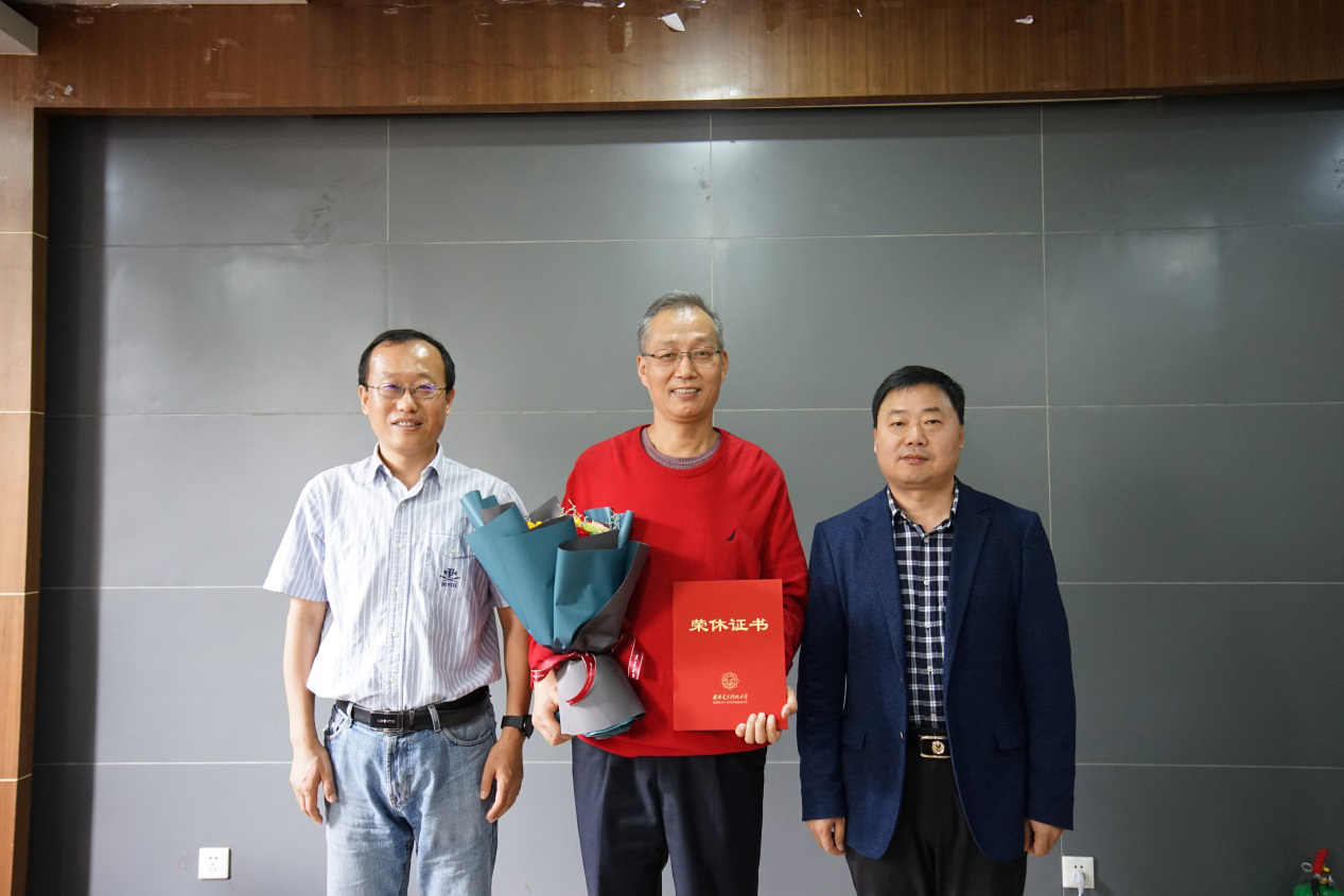 会后,独国社和邵晓鹏为学院五名退休教职工颁发了荣休证书并合影留念。
