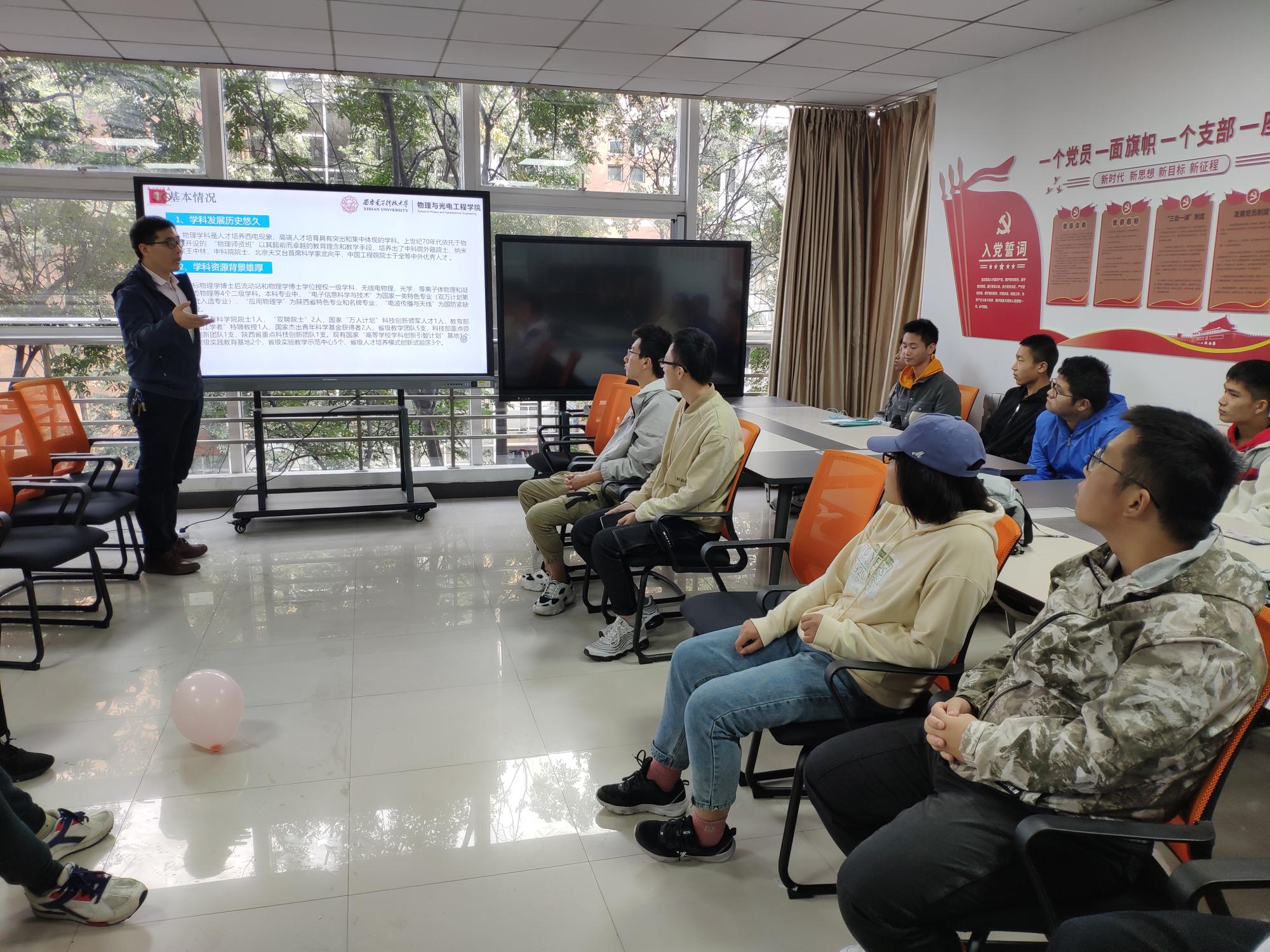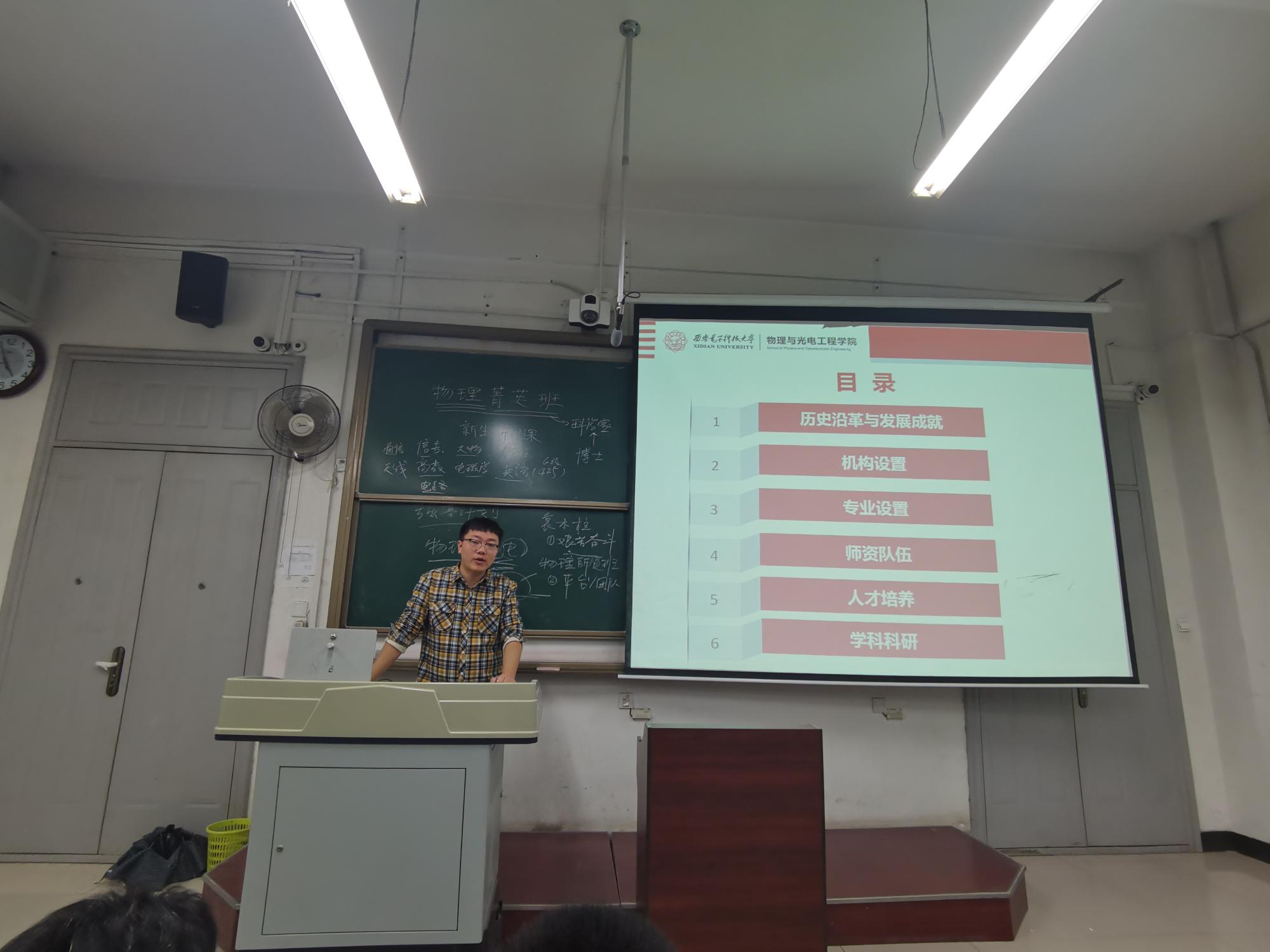 10月15日下午,物理与yl8858永利集团2020级新生辅导员袁本柱在A楼220教室为物理菁英班全体同学带来了一场别开生面的新生研讨课。课堂由物理团队班的故事展开,他在课上说到,发扬“艰苦奋斗”的西电精神是学好基础学科的必要条件,肯吃苦,多钻研才能悟出物理的乐趣。同学们纷纷表示将潜心学习,重现辉煌。最后,课程在轻松愉快的氛围中圆满结束。