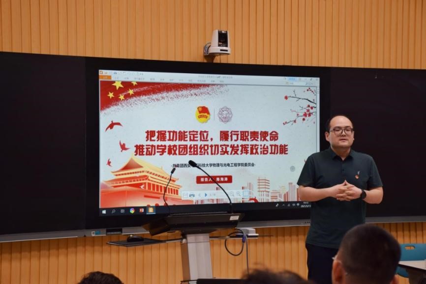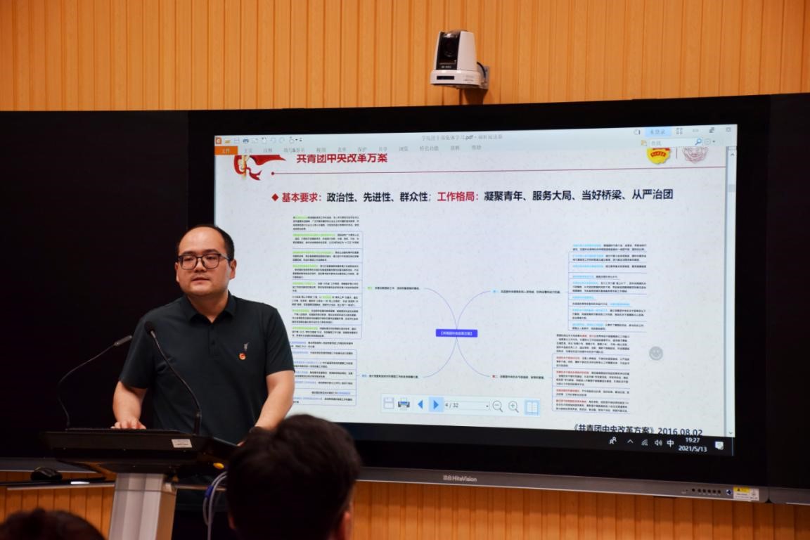 首先,陈海涛老师以《共青团中央改革方案》《深化学校共青团改革的若干措施》等文件要求开篇,介绍了共青团工作的基本要求和工作格局,要求高校团学干部在平时工作中履行职责使命,重点强调了共青团工作的政治性、先进性、群众性,并就这三方面详细的列举了在日常工作推进中的相关实例,让大家能够更加贴切的理解其真正含义,并融入到自己平时的工作当中,积极推动学校共青团组织切实发挥政治功能。
