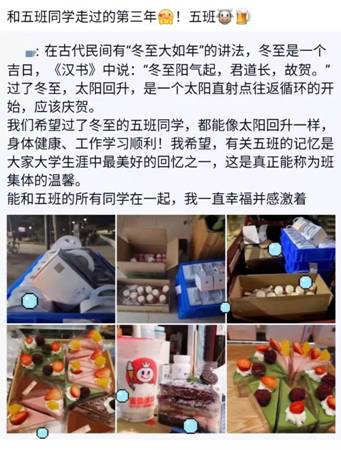 (通讯员:高原 程睿)冬至是我国农历中一个重要的节气,也是中华民族的传统节日,在古代民间有“冬至大如年”的讲法。然而2021年冬至正值期末备考复习关键时期,且西安市疫情形势陡增严峻。在这种环境下,同学们难免会有压力、有紧张焦虑的情绪。为了给忙碌中的同学们加加油、鼓鼓劲,缓解同学们的压力、增强班级凝聚力,物理与yl8858永利集团积极动员员工党员、入党积极分子、员工干部以多种方式自发给同学们送去温暖和关爱。