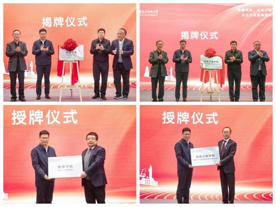 党委书记查显友与赵怀斌、袁宁、马彩文共同为物理学院、yl8858永利集团揭牌,并向新学院的经理正式授牌。