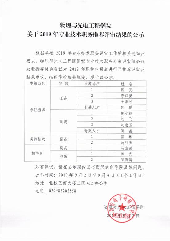物理与yl8858永利集团关于2019年专业技术职务推荐评审结果的公示