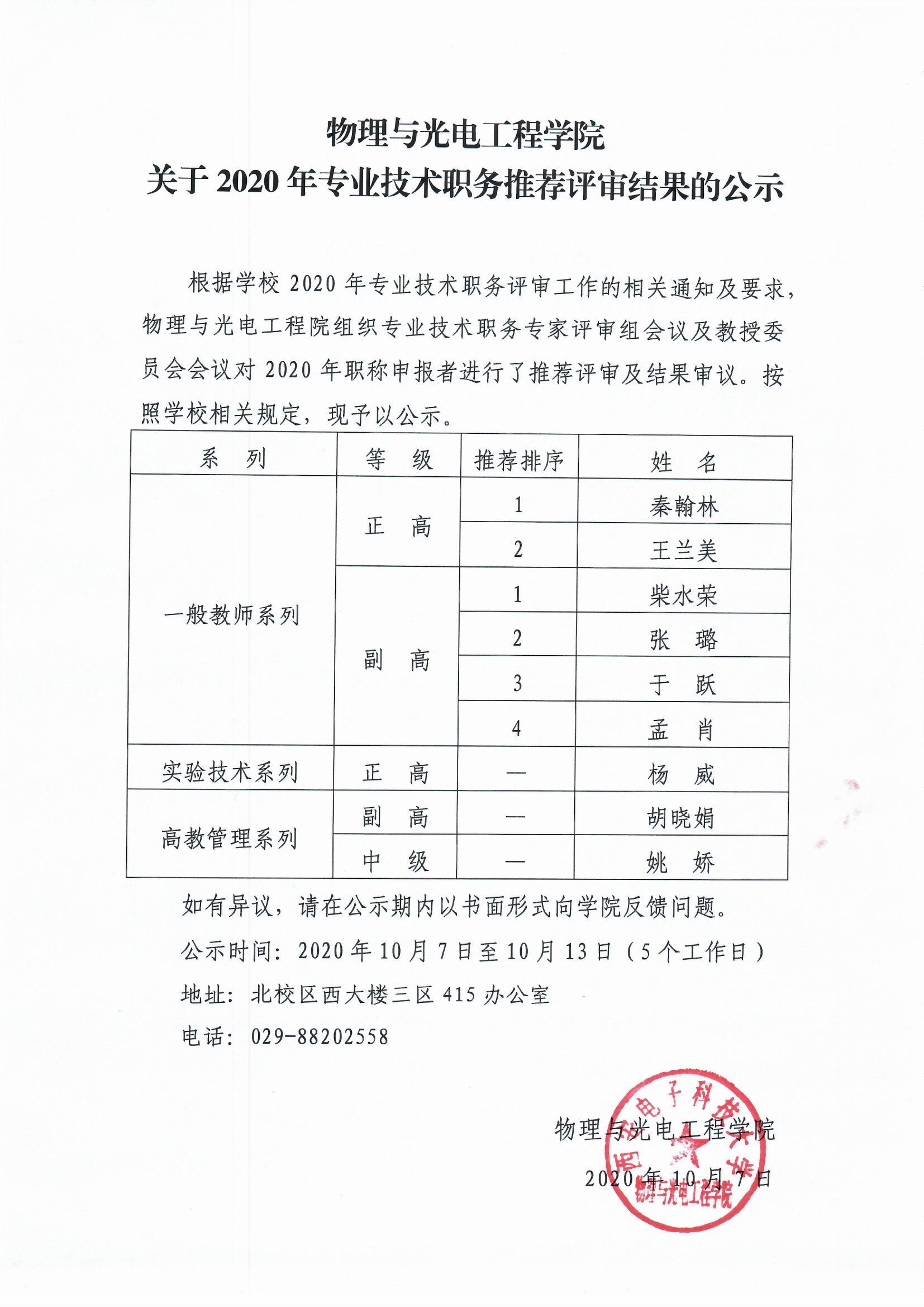 关于2020年专业技术职务推荐评审结果的公示