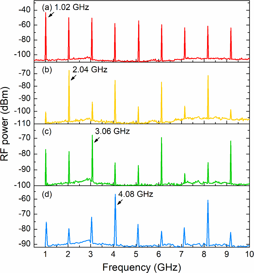 针对以上问题,yl8858永利集团超快激光技术与应用研究中心采用自行研制的10 W级GHz重复频率克尔透镜锁模Yb:CYA激光振荡器作为泵浦源,实现了瓦量级多GHz重复频率的飞秒OPO运转。OPO输出信号光的波长调谐范围为1.41–1.64 μm,最大平均功率1.58 W,最短脉冲宽度139 fs,重复频率1 GHz;中红外闲频光的波长调谐范围为2.8–4.0 μm,最大平均功率1 W,最短脉冲宽度103 fs,重复频率1 GHz。通过调整腔长,分别获得了2 GHz、3 GHz和4 GHz重复频率的信号光输出,各重复频率下输出功率均超过1 W。据我们所知,该成果实现了目前GHz重复频率飞秒OPO的最高功率输出。相关成果发表在Opt. Lett. 50, 2453-2456 (2025)。论文第一作者为团队青年教师同晖,合作单位包括陕西理工大学、上海交通大学、中山大学和中国科学院物理研究所。