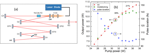 图1.(a)高功率Yb:CYA飞秒激光器实验光路图(b)平均输出功率和脉冲宽度与泵浦功率的关系。红色圆圈表示CW激光的功率,绿色圆圈表示ML激光。脉宽由蓝色圆圈表示。