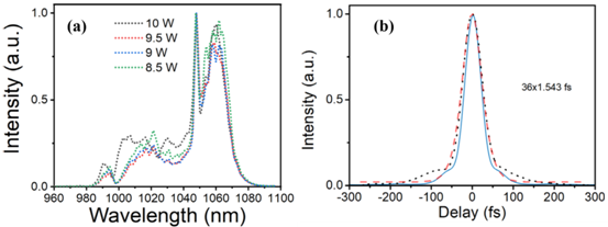 图2(a)克尔透镜锁模Yb:CYA振荡器锁模光谱曲线和(b)脉冲强度自相关曲线