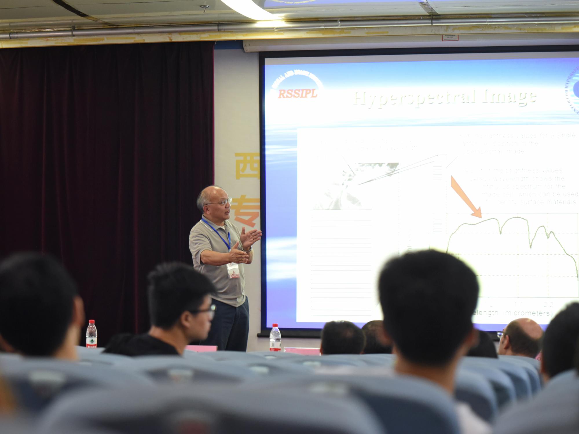 随后,引智基地学术大师Chein-I Chang教授上台致辞。他首先肯定了学校及学院为基地建设所做的贡献。他谈到,“111”基地是一个很好的平台,给学科领域的学者们提供了一个共同交流的平台,希望能够秉承“1+1>2”的合作主旨,深入研讨,进而促进国际合作,共同发展。随后他还介绍了自己研究的高光谱技术在食品安全、医学影像、环境保护、农产品品质管制等方面的应用。