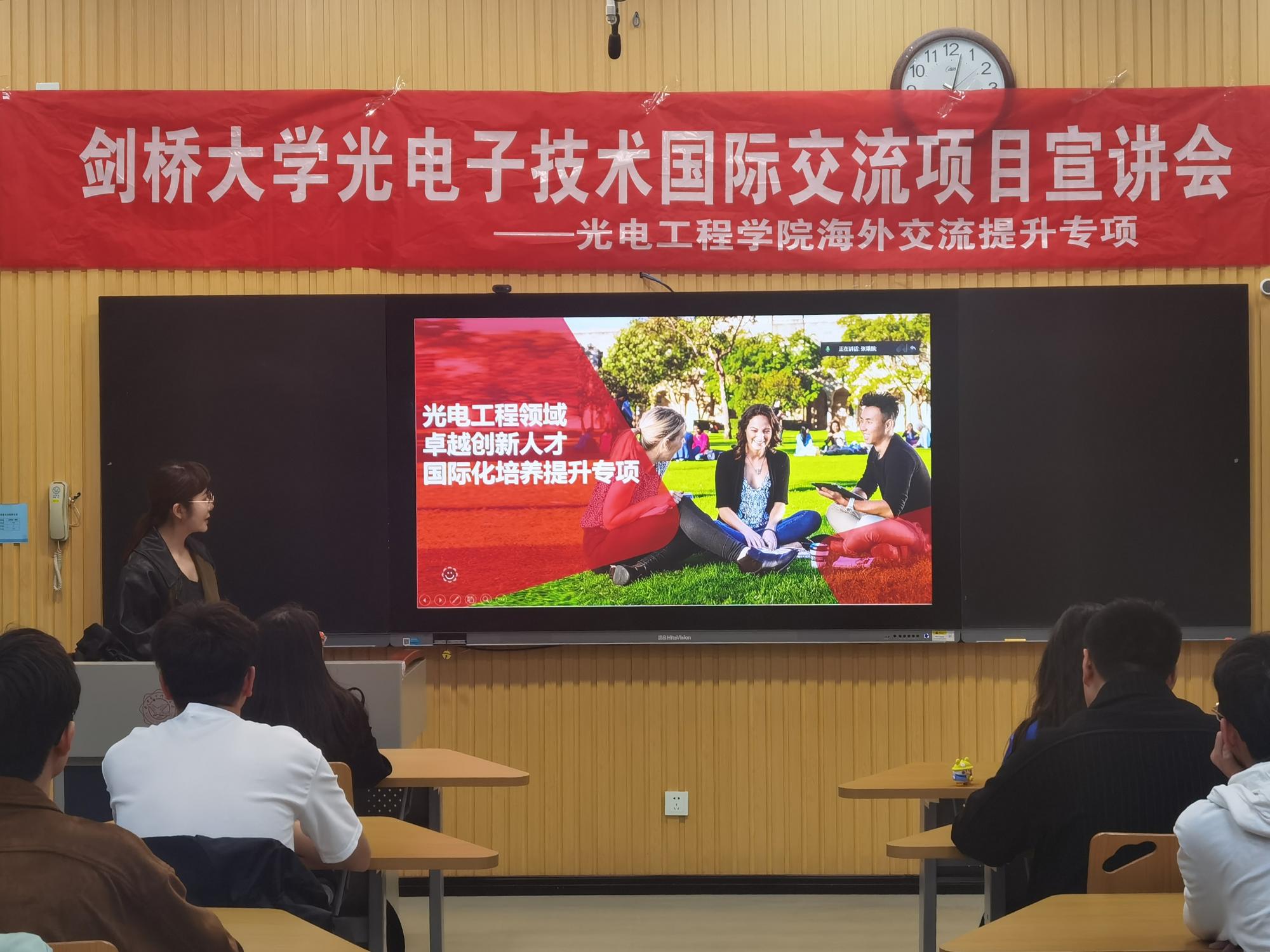 (通讯员:王纲、马力、李佳铭、姜萌)4月28日,yl8858永利集团在南校区C131教室顺利召开剑桥大学光电子技术暑期访学项目宣讲会,全美国际教育协会殷汝姗老师,电子科学与技术卓越班负责人来志老师同线上线下近50位本科生共同参加项目宣讲会。宣讲会由学院外事干事王纲主持。