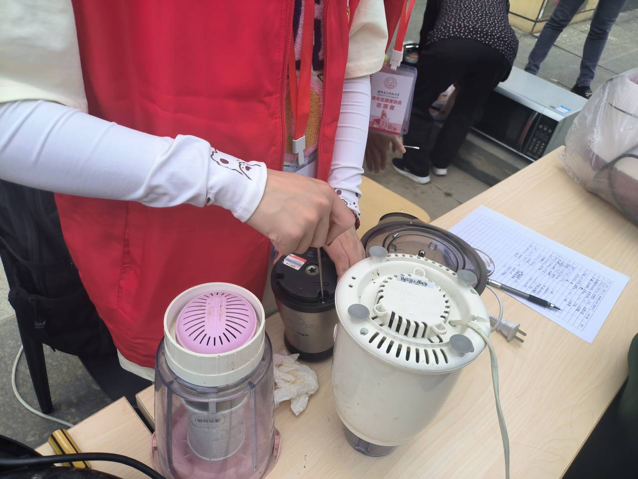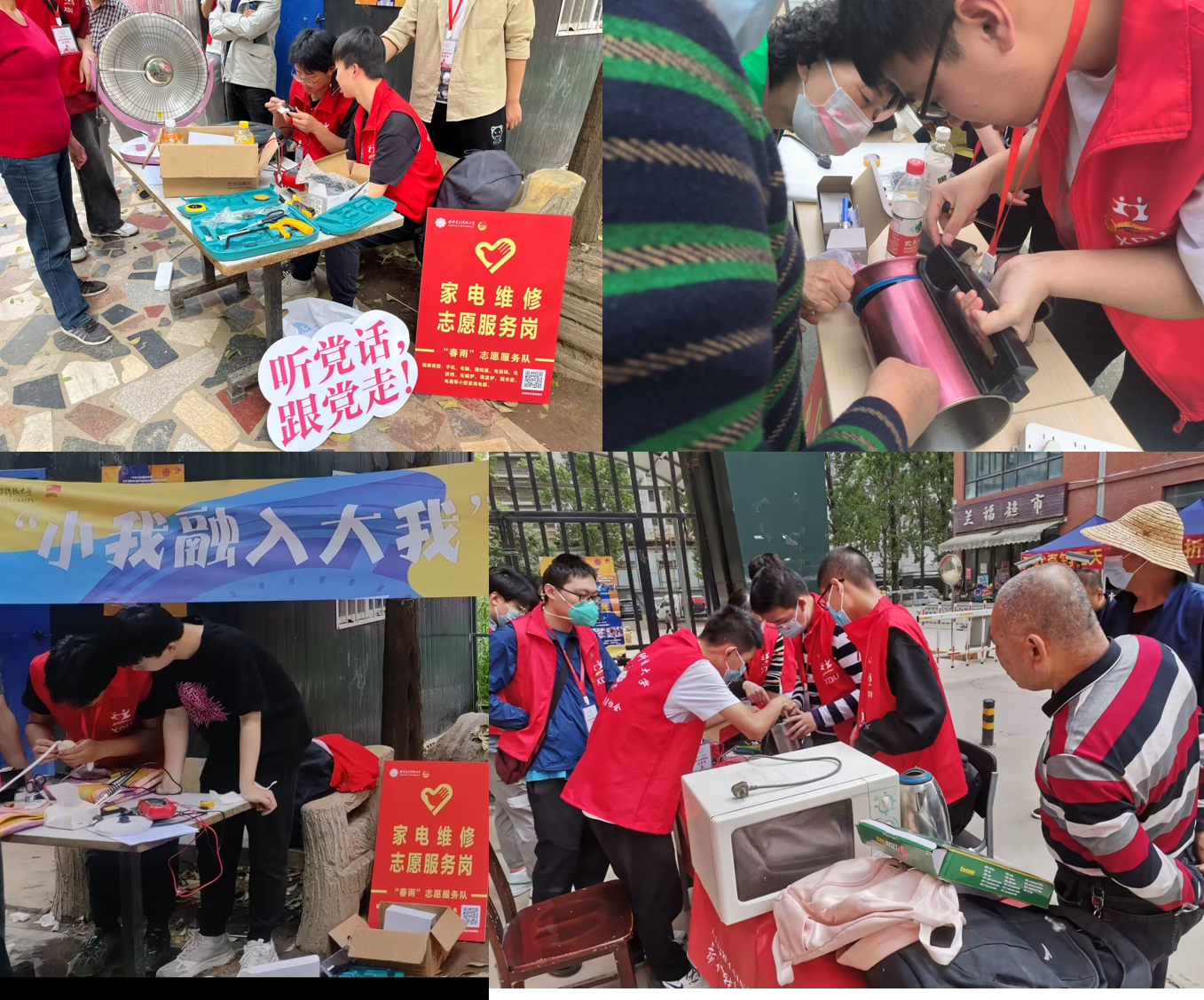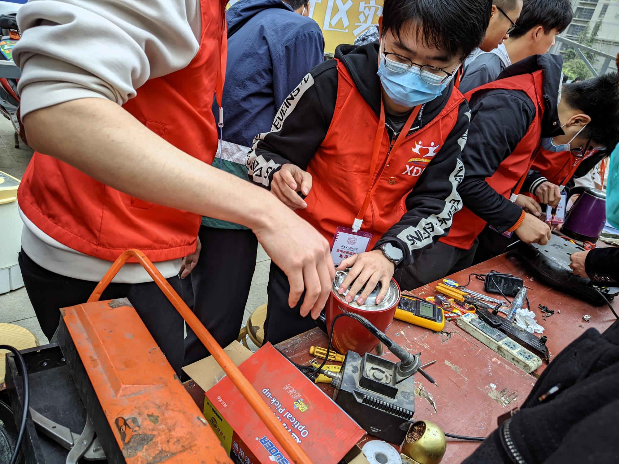志愿者分工明确,检修、登记、引导、组织、物资等角色通力配合,有条不紊地对闻讯前来的100余位社区居民进行接待,对需要维修的家用电器进行登记维修,本次志愿服务共检修了包括烧水壶、电压力锅、电饭锅、加湿器等在内的40余个损坏电器。