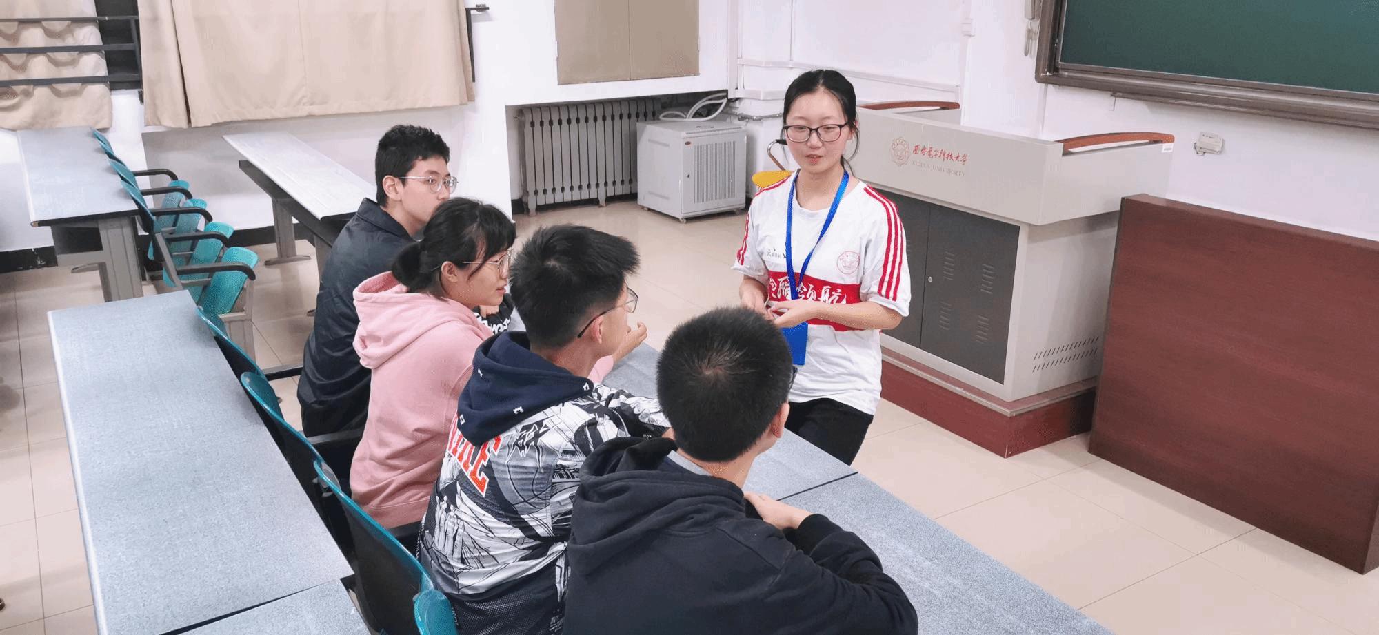 我向他们介绍了一些关于入学考试和课程的问题——介绍了平时上课的上课模式,平时上课和高中上课的模式差不多,但是大学时间自由时间比较多,学习一方面需要认真听讲,更重要的是自己下功夫,平时大家可以选择去图书馆或者教学楼自习,一个人的时候也可以在宿舍自习,主要还是得自律。
