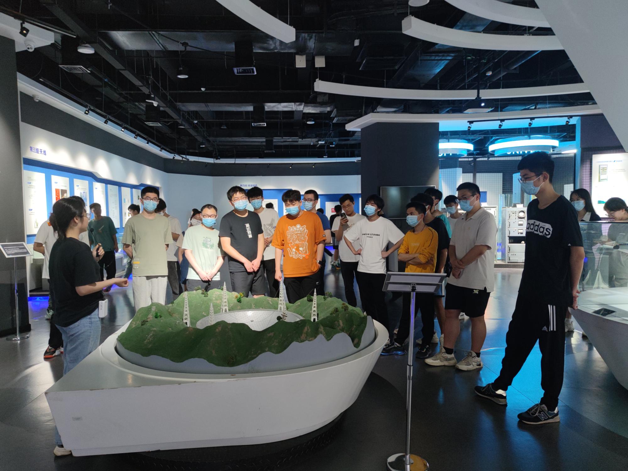 随后,学员们来到雷达厅,这里展示了六组展区,第一组雷达系统整机,第二组雷达的“大脑”---雷达信号处理机,第三组展示组天线,第四组微波组件展区,第五组雷达显示终端,第六组电子对抗。本展厅重点展示了有“中国天眼”之称的500米口径球面射电望远镜模型(FAST),公司段宝岩院士团队在该项目设计中贡献了“西电智慧”。