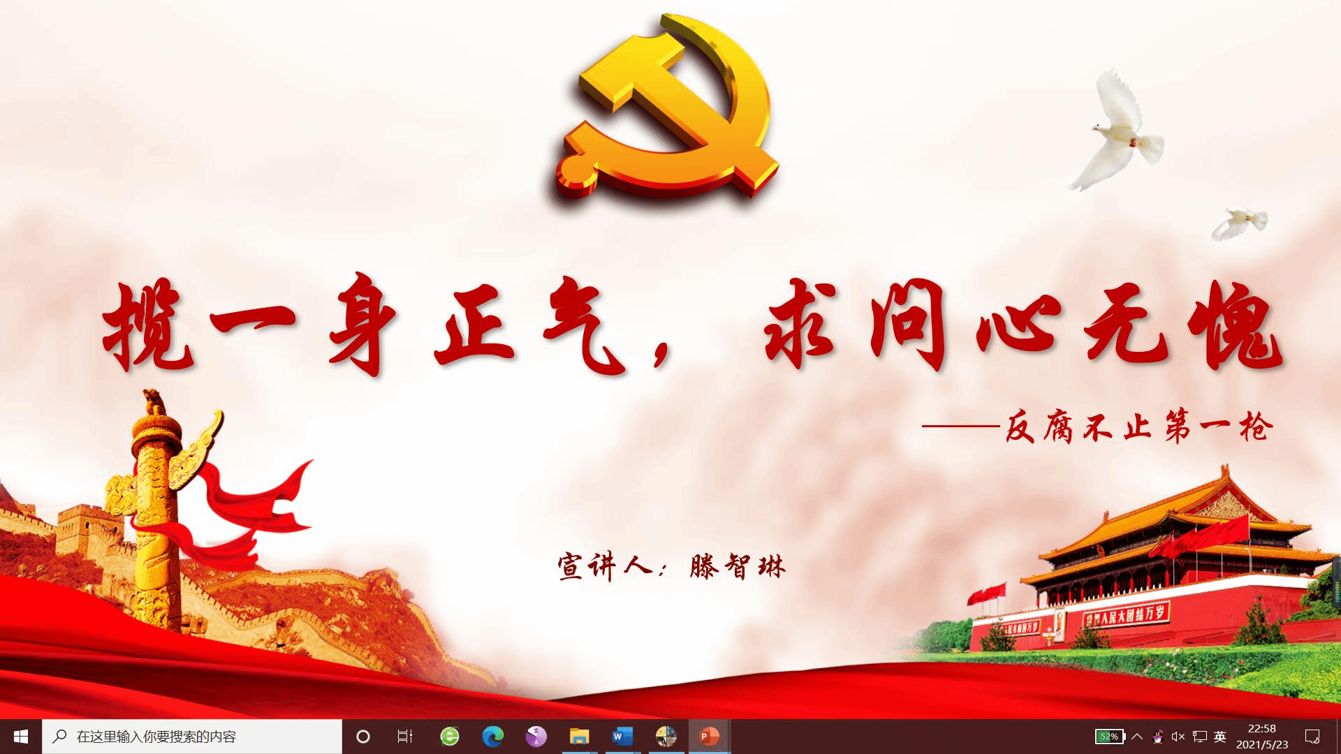 为加强党史教育、传承红色基因。5月23日21:00,物理与yl8858永利集团本科19级党支部面向支部成员、积极分子、班级干部开展党史宣讲活动,老员工党史校史宣讲团成员滕智琳以《揽一身清气,求问心无愧——反腐不止第一枪》为主题进行党史宣讲。