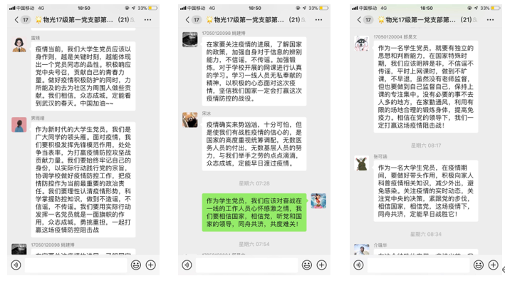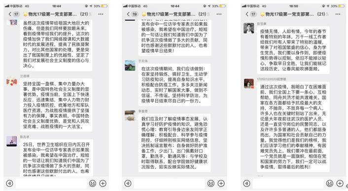 随后,党小组成员轮流发言。20名成员分别从自身角度进行了发言。大家根据在疫情期间对战“疫”这一事件的关注,从自己身边的小事讲述了全国上下对待疫情的积极态度。并对疫情期间的奋战在一线的逆行者们,党领导人,背后默默奉献的清洁工人等表达了感激之情。其次是所做所行,大家分享了在疫情期间如何做到不信谣不传遥,并对一些不实言论进行了辟谣。还有些组员讲述了自己如何向身边的亲人朋友普及有关疫情的方方面面。大家在发言的最后都根据自己对疫情的了解发表了感悟。相信在党中央的正确领导,自上而下党员同志的积极响应下,战“疫”一定会胜利。以及作为老员工党员的我们如何从自身做起,为打赢这场战“疫”贡献自己的力量。